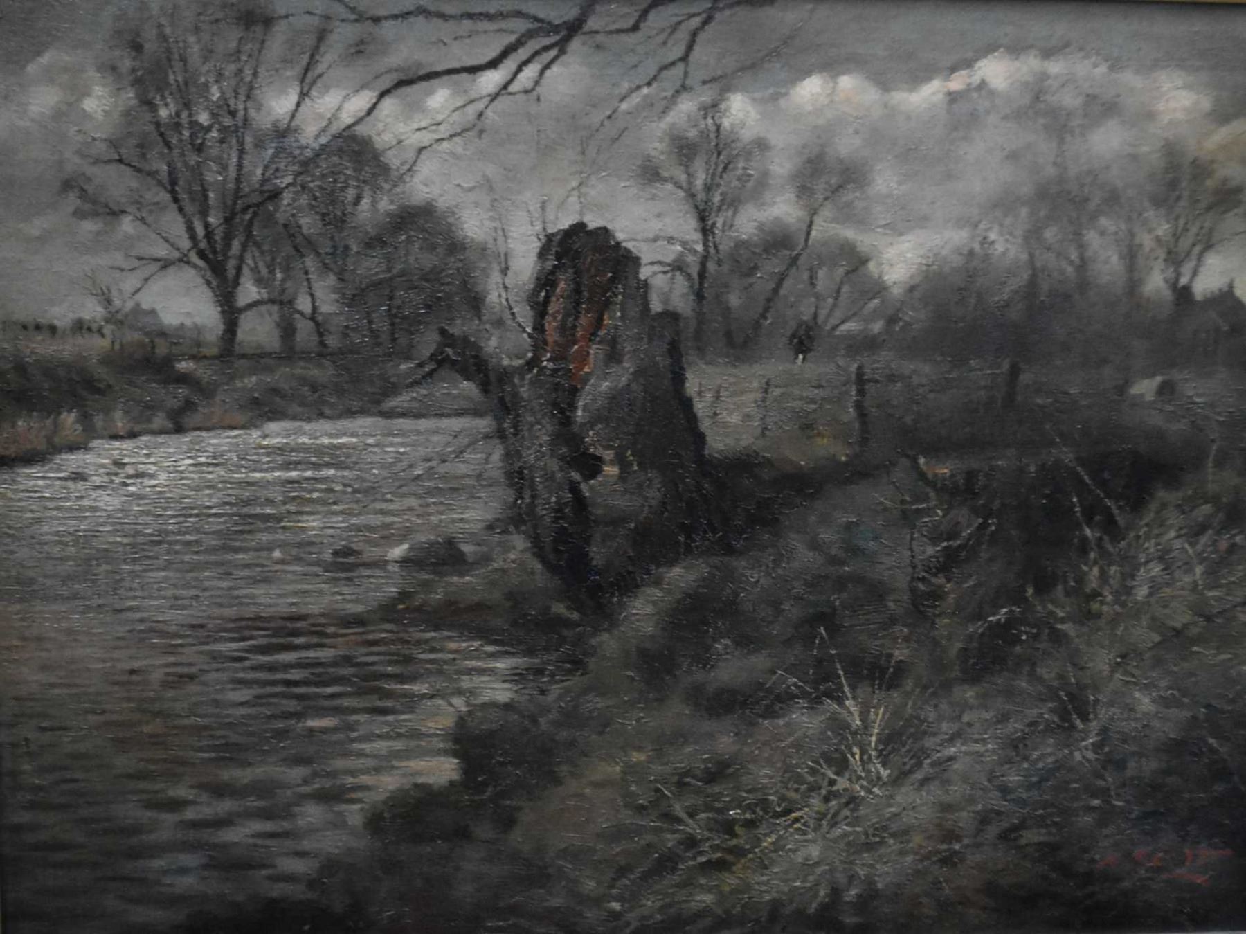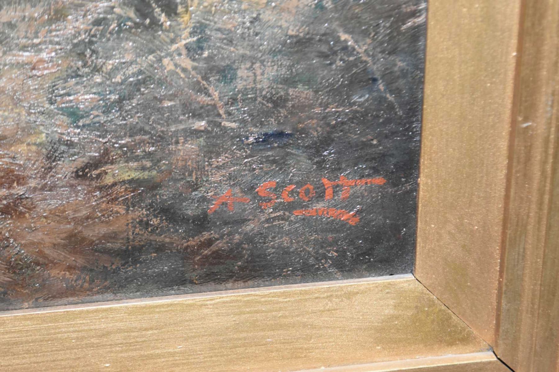 Gilt framed oil on canvas painting of a autumn creek scene signed by artist A. Scott, 14" X 18"