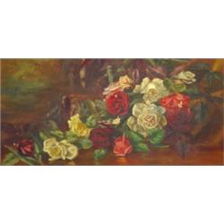 Gilt framed oil onto canvas of still life roses, 60cm x 28cm