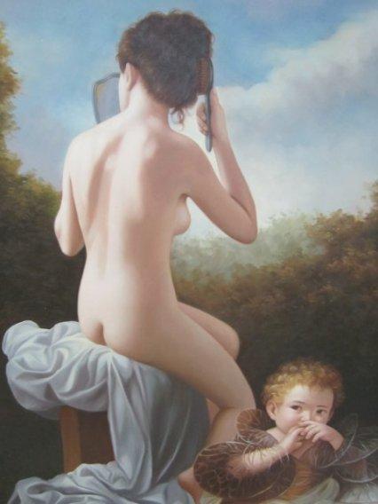 "Nude Brushing Hair with Child". Reproduction. Approx. 35" x 40" Please read our terms of sale.