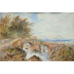 Gilt framed watercolour of people and a wagon train on a bridge, Malvern, initialled EJM 1869, 36cm x 24cm