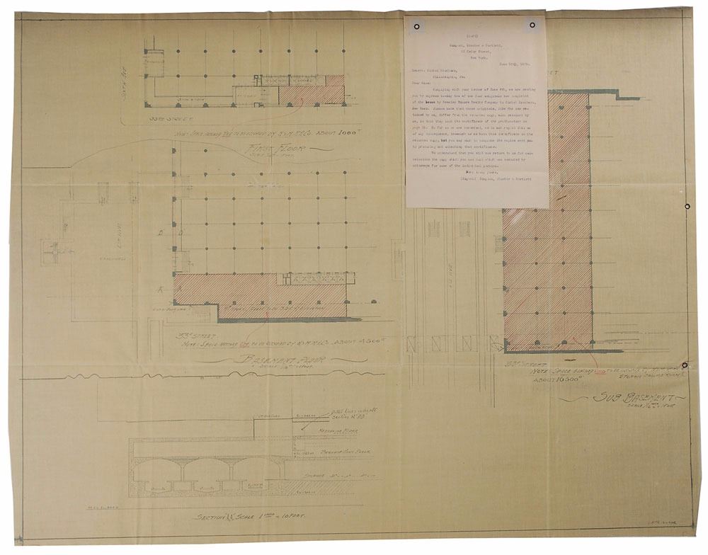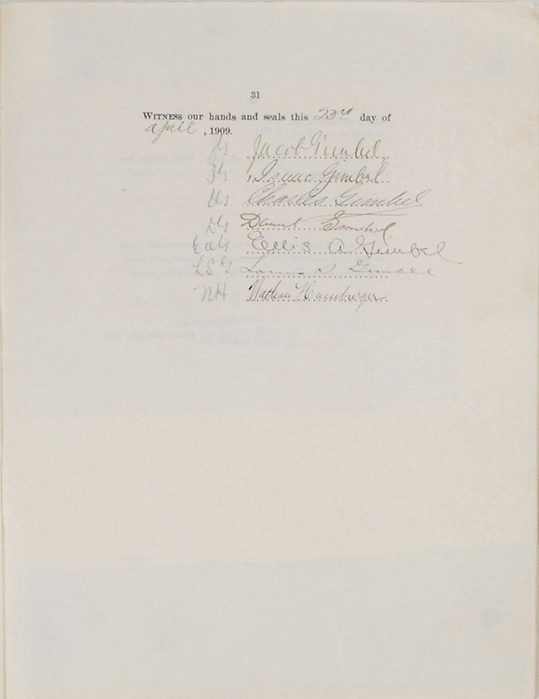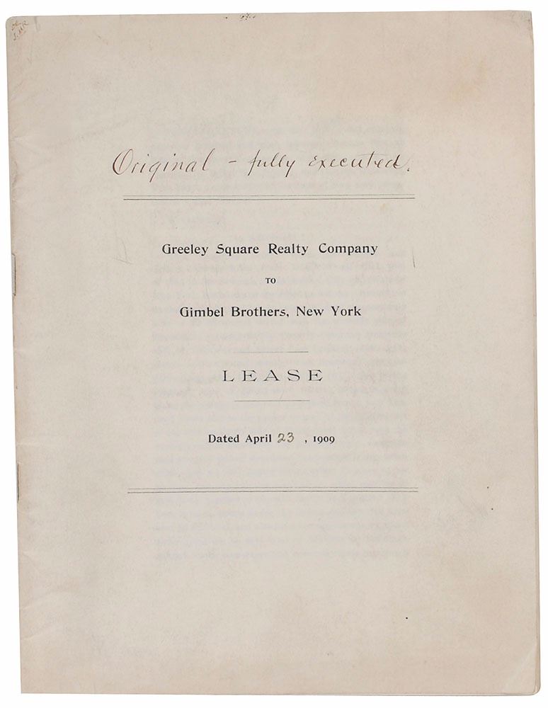 Lengthy partly-printed DS, signed “Jacob Gimbel,” “Isaac Gimbel,” “Charles Gimbel,” “Daniel Gimbel,” “Ellis A. Gimbel,” “Louis S. Gimbel,” and “Nathan Hamburger,” 31 pages, 8 x 10.5, April 23, 1909. The original 21–year lease agreement between Greeley Square Realty Company and Gimbel Brothers, New York, for the land upon which they built their flagship NYC department store. The agreement dictates that they pay $605,000 for the first three years beginning on August 1, 1910, increasing over time to $655,000 until the end of the lease on July 31, 1931. It also provides terms granting the Hudson & Manhattan Railroad Company “the right to the exclusive use and occupation of the spaces hereinafter specified, for the purpose of handling and storing baggage, mail and express matter, and for ticket offices and any other necessary purposes of and adjuncts to…the underground railroad station to be located at Broadway and Thirty-third Street.” Attached at the conclusion is a fold-out floor plan of the store, 35 x 27.5, showing the sub-basement, basement, and first floor, also noting, “9th Story Floor to be 327.47´ elevation.” Sections of the plan are marked with red diagonal lines noted “space hatched red to be occupied by H. & M.R.R. Co.” In fine condition, with expected document wear and light soiling to the cover.