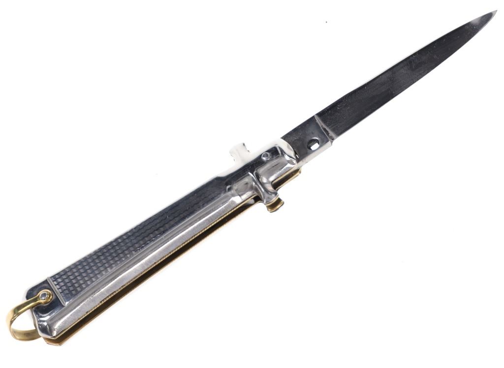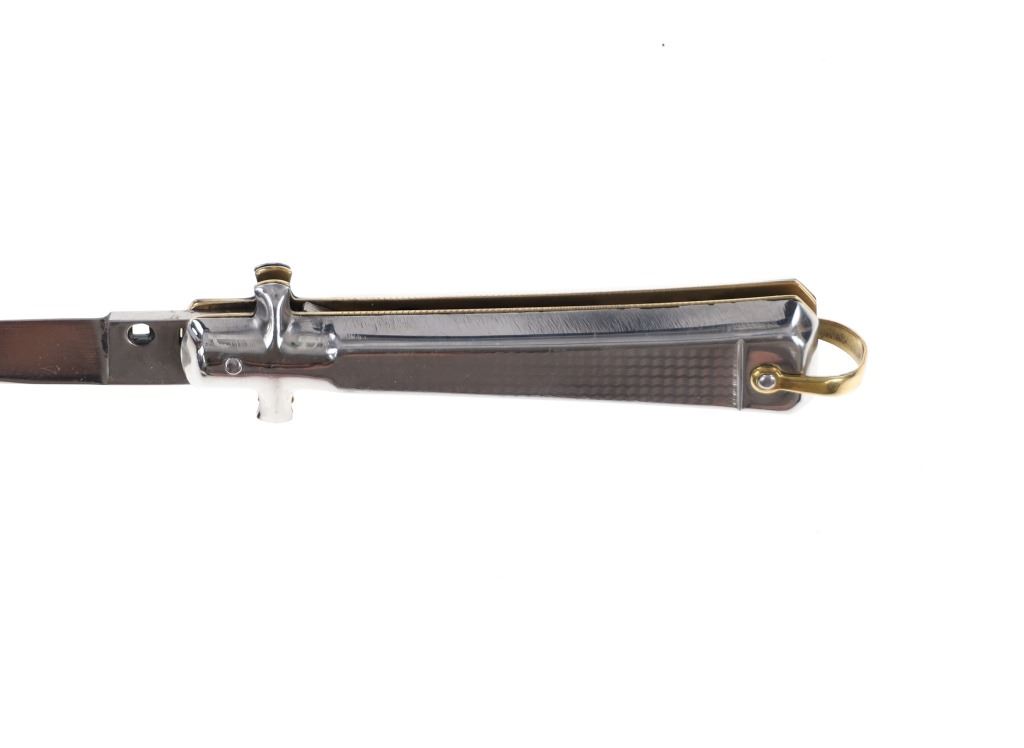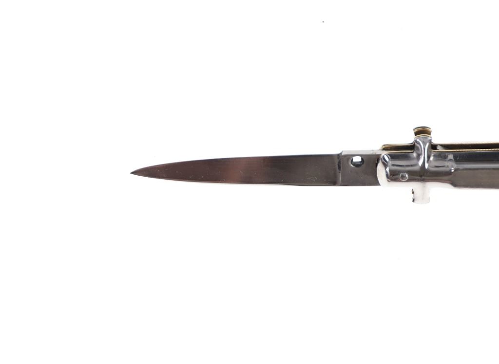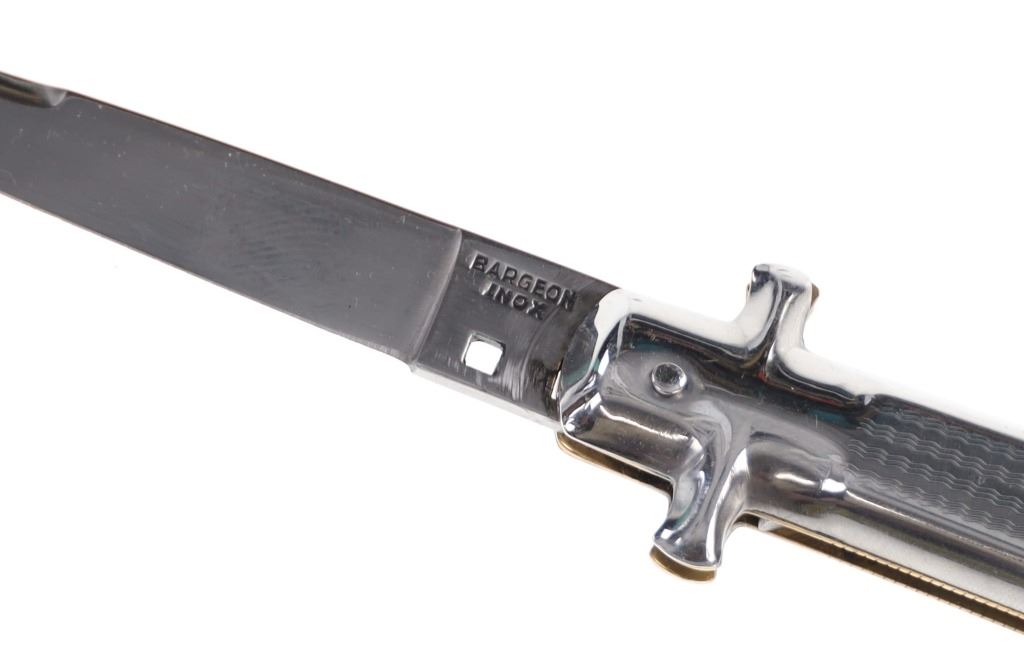 For your consideration is this Gimel Bargeon Inox French stiletto switchblade made in the late 20th century. The knife features a polished and etched stainless steel handle, blade, bolster and pommel. The spring mechanism and locking mechanism are the same style as the Italian stilettos. The knife shows a strong action and good functionality. The knife shows good condition overall with little to no wear present and no signs of damage noted. When opened, the knife measures 7 3/8" long with the blade measuring 3 1/4" long. When closed, it measures 4 1/8" L x 1 1/8" W and weighs 82.4 grams.