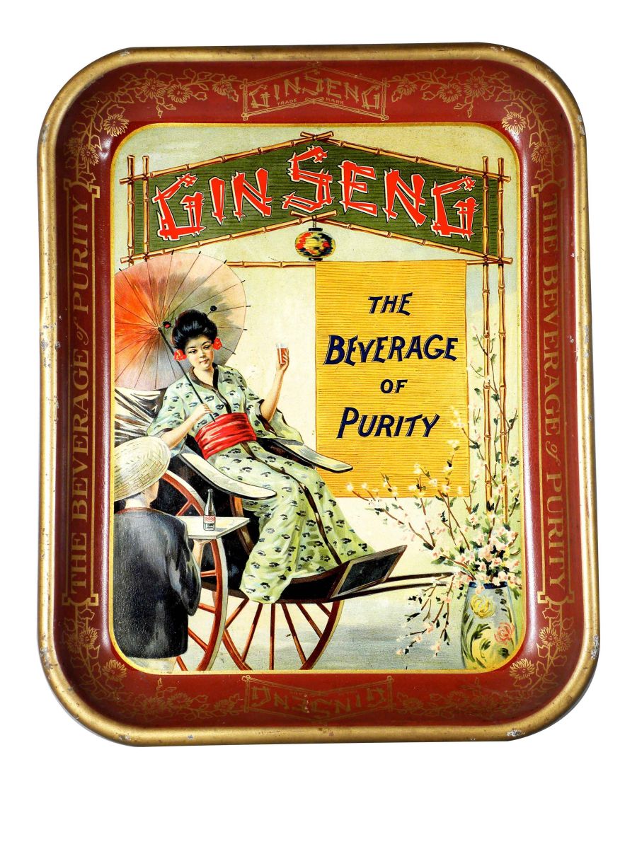 Gin Seng Beverage Tin Serving Tray. Some normal crazing and minor edge ware otherwise excellent condition. 10 1/2 X 13 1/4 inches.