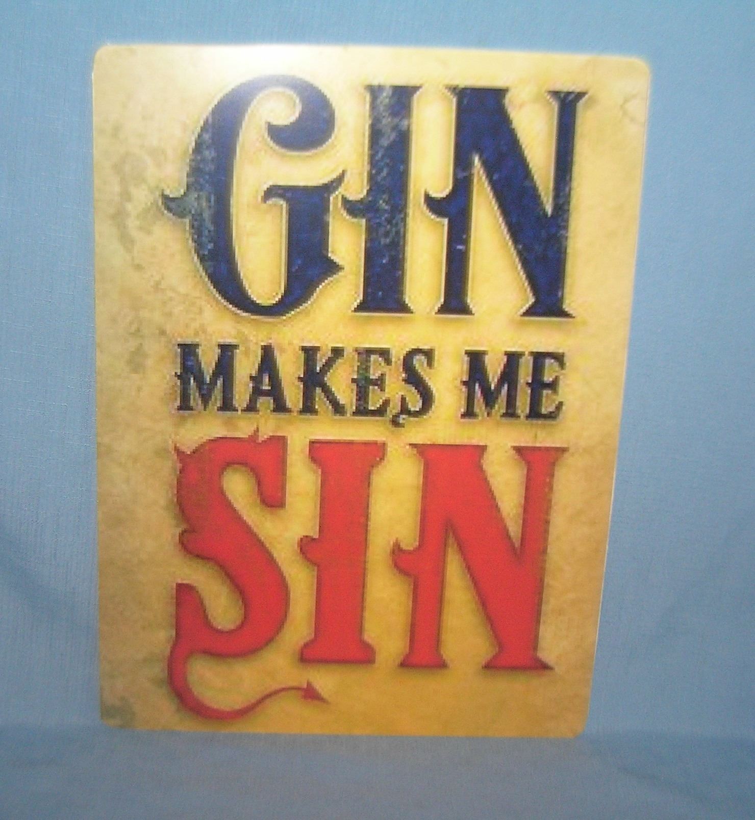Gin makes me sin retro style advertising sign printed on PVC hard board these signs are auctioned for there decorative and display purposes 12x16 est. value $50.00-$60.00