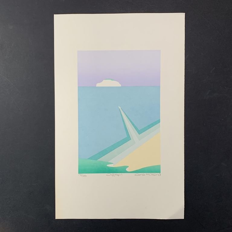 Gina Holland's "Clifftop I" Limited Edition Print. A boat is leaving port, heading into the sunset. This piece is signed lower right, numbered 173/300 lower left and titled lower middle. It is in excellent condition.