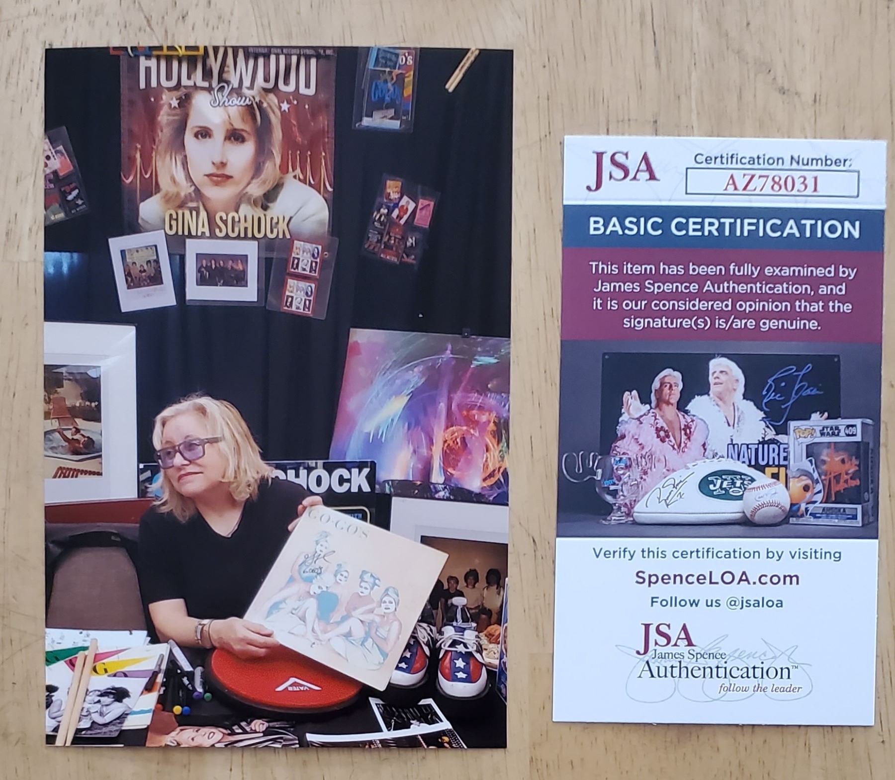 I acquired the autograph of Gina Schock on an album at the Hollywood Show held at the Burbank Airport Marriott Hotel. She signed the album cover at my request in my presence. I took a photo of her signing. I guarantee that the signature is authentic. JSA authenticated the autograph, providing a Certificate of Authentication numbered AZ78031.
