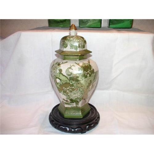 Lovely ginger jar on wooden stand made in Japan for Heygill Imports. Green, cream and gold designs with peacocks. Stands 11" tall. Excellent condition with no nicks, chips or cracks.
