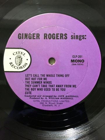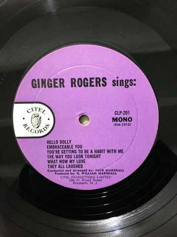 "Hello, Ginger!" Ginger Rogers autographed LP, released in 1965, includes original cover and vinyl record. The album cover has a photo of Ginger Rogers in front of an orange background with a photo of flowers in the top right corner. Purple dots surround the photo and underline the album title. Between the photo and title are the songs listed on the record: What Now My Love; Hello Dolly; Getting To Be A Habit With Me; Let's Call The Whole Thing Off; They All Laughed; Embraceable You; But Not For Me; They Can't Take That Away From Me; Cute; The Boy Who Used To Be You; The Way You Look Tonight; Summer Winds. Conducted and arranged by Jack Marshall. LP is signed by Ginger Rogers to Jack, the owner of this item who personally met Ginger Rogers at the stage door of the Forrest Theater in Philadelphia when she was touring Hello Dolly.