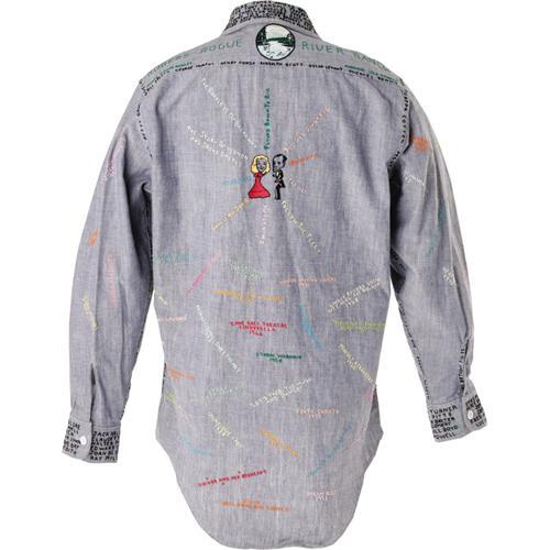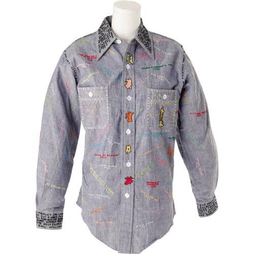 <B>Ginger Rogers Hand-Decorated Denim Shirt.</B></I> A large denim shirt hand embroidered top-to-bottom with the titles of movies Rogers appeared in, the names of stars she worked with, and the awards she won, as well as tiny dancing figures sewn between the button holes. Rogers reportedly wore this shirt at public appearances. In Excellent condition.<I>From the Robert Johnson Memorabilia Collection.</B></I><BR><BR><b>Shipping:</b> Clothing, Costumes & Jerseys (<a target="_blank" href="http://www.heritageauctions.com/common/shipping.php">view shipping information</a>)