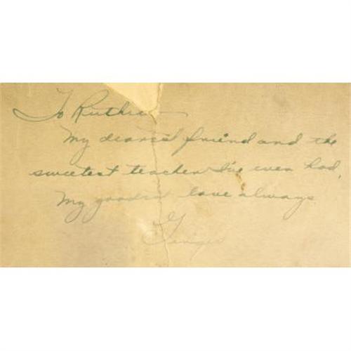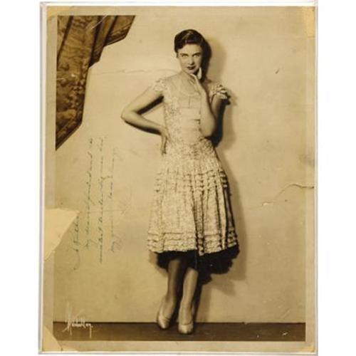 <B>Ginger Rogers Signed Photo.</B></I> A rare b&w 11" x 14" photo of Ginger Roger from her early vaudeville days, inscribed "To Ruthie -- my dearest friend and the sweetest teacher I've ever had, my goodest love always" and signed by Rogers in green ink. Ruthie was Ruth Browning, Rogers' 8th grade teacher and an important influence in her life. The photo is in Very Good condition with pieces missing from the corners, a large piece missing from the left edge that slightly affects part of the inscription, a large tear near the right edge, and a flap tear to the left edge that runs through the inscription and signature. It is accompanied by a copy of Rogers' autobiography, which mentions Browning on pages 393-395, and a b&w 8" x 10" photo of Browning. <I>Accompanied by a COA from PSA/DNA.</B></I><BR><BR><b>Shipping:</b> Books & Catalogs (<a target="_blank" href="http://www.heritageauctions.com/common/shipping.php">view shipping information</a>)