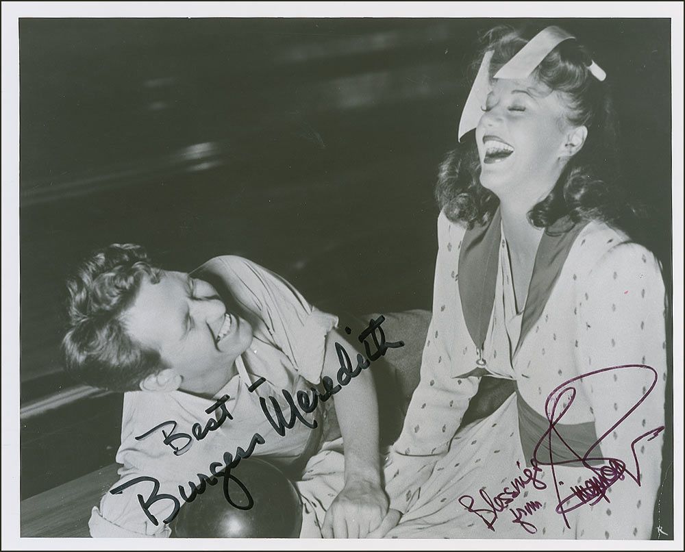 Glossy 10 x 8 photo of the pair from Tom, Dick, and Harry, signed in black felt tip, “Best—Burgess Meredith,” and “Blessings from Ginger Rogers.” Scattered creases and dings, paperclip impression to right edge, and some scattered light spotting to emulsion, otherwise fine condition.