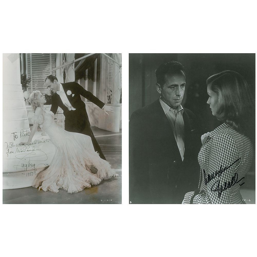 Two items: a glossy 8 x 10 photo of Lauren Bacall with husband Humphrey Bogart in the 1946 film The Big Sleep, signed in black felt tip by Bacall; and a glossy 8 x 10 full-length photo of Ginger Rogers and Fred Astaire during one of their movies, signed and inscribed in black ink, "To Rick, With every good wish from Mimi and—Ginger Rogers, 1987." In overall very good to fine condition, with overall creasing to the Rogers photo.