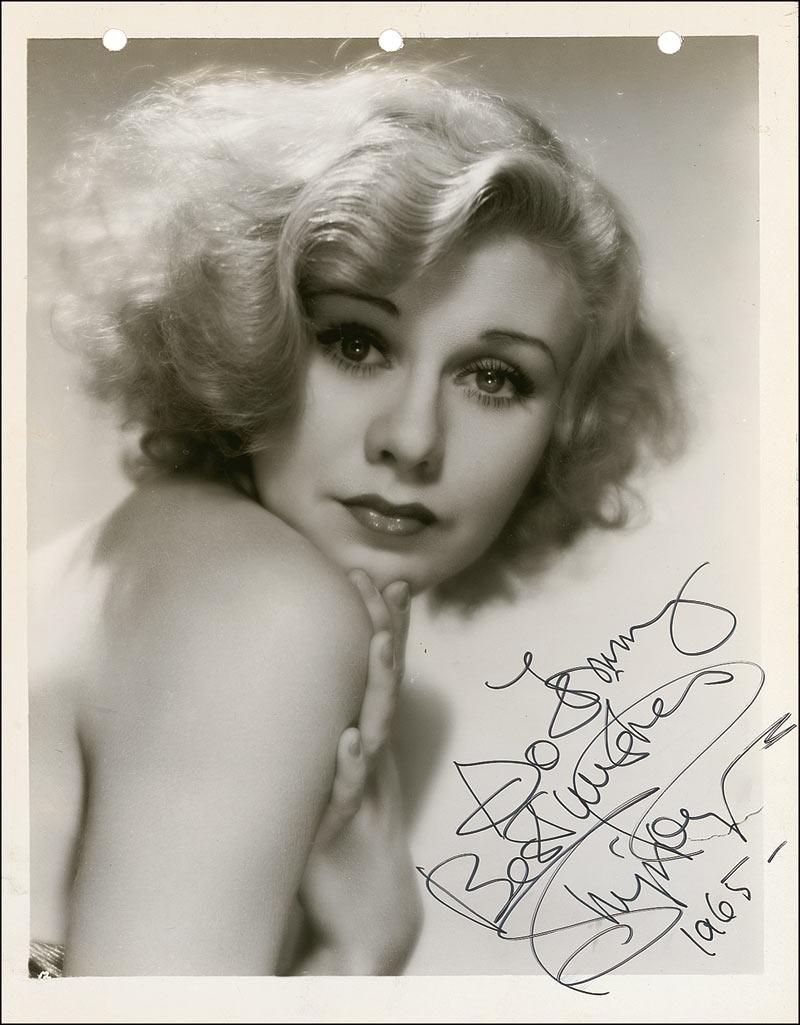Glossy 8 x 10 photo Rogers looking coyly at the camera, signed and inscribed in felt tip “To Tommy, Best wishes, Ginger Rogers 1965.” Date-stamped on the reverse December 6, 1965. In very good condition, with a few surface marks and stains, three punch holes at the top edge, and show-through from mounting residue on the reverse.