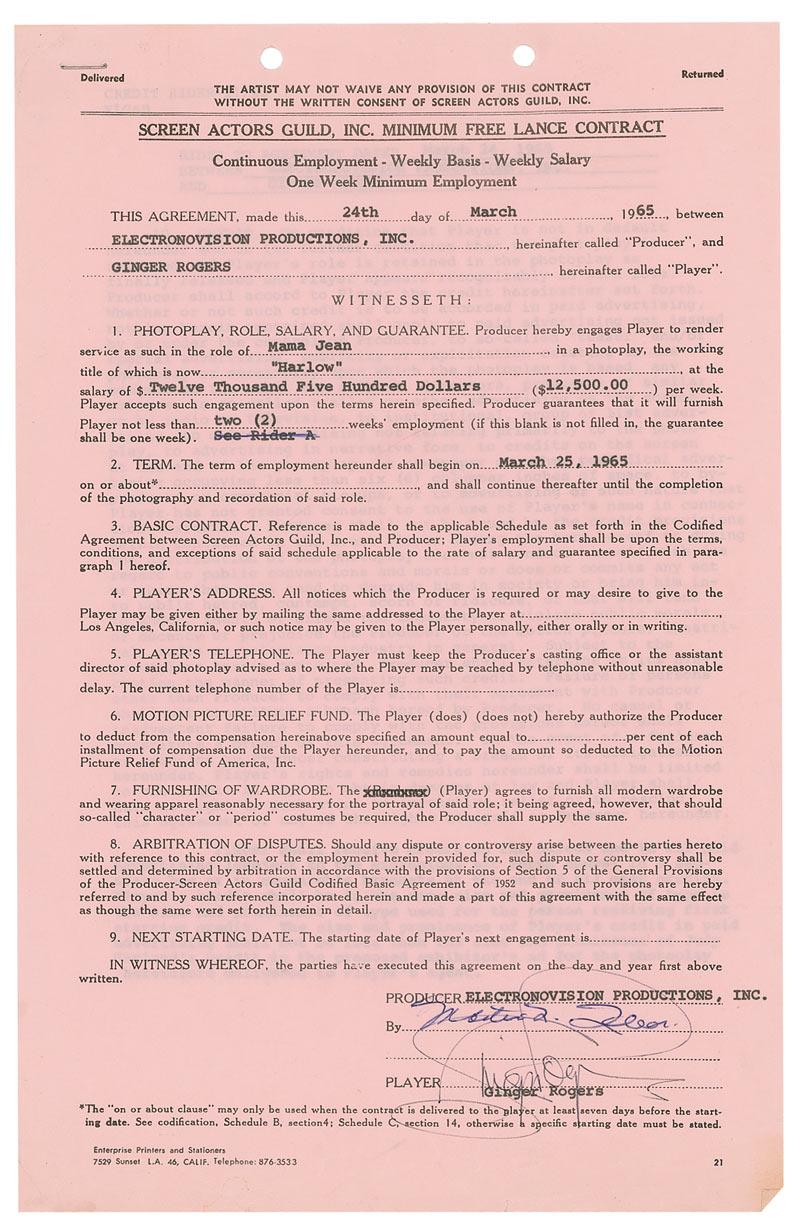 DS, signed “Ginger Rogers,” one page, 8.5 x 13, March 24, 1965. Screen Actors Guild Minimum Free Lance Contract between Rogers and Electronovision Productions. In part: “Producer hereby engages Player to render service as such in the role of Mama Jean in a photoplay, the working title of which is now ‘Harlow,’ at the salary of…$12,500 per week. Player accepts such engagement upon the terms herein specified. Producer guarantees that it will furnish Player not less than two (2) weeks’ employment…The term of employment hereunder shall begin on March 25, 1965.” In fine condition, with wrinkling and a few creases, two punch holes at the top of the page, and an unsigned rider stapled at the top left corner.