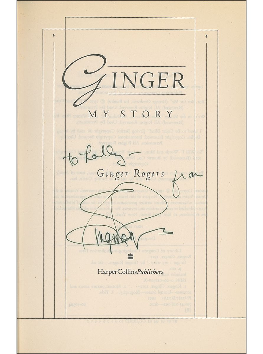 Signed book: Ginger: My Story. First edition. New York: HarperCollins, 1991. Hardcover with dustjacket, 6.25 x 9.5, 450 pages. Signed and inscribed on the title page, “To Lolly from Ginger Rogers.” In fine condition, with a slightly fuzzy appearance to signature and inscription, mild toning to top edges, and some light wear to dustjacket.