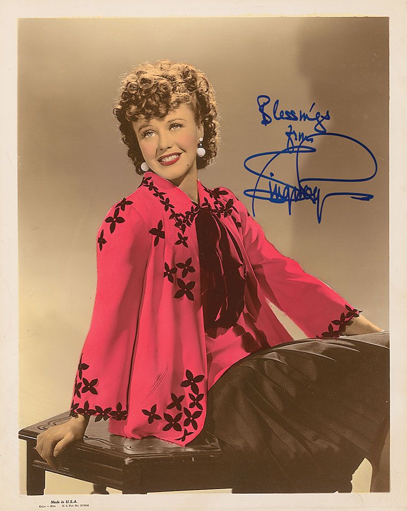 Color glossy 8 x 10 photo, signed in blue felt tip, “Blessings from Ginger Rogers.” In fine condition, with some creasing along right edge.