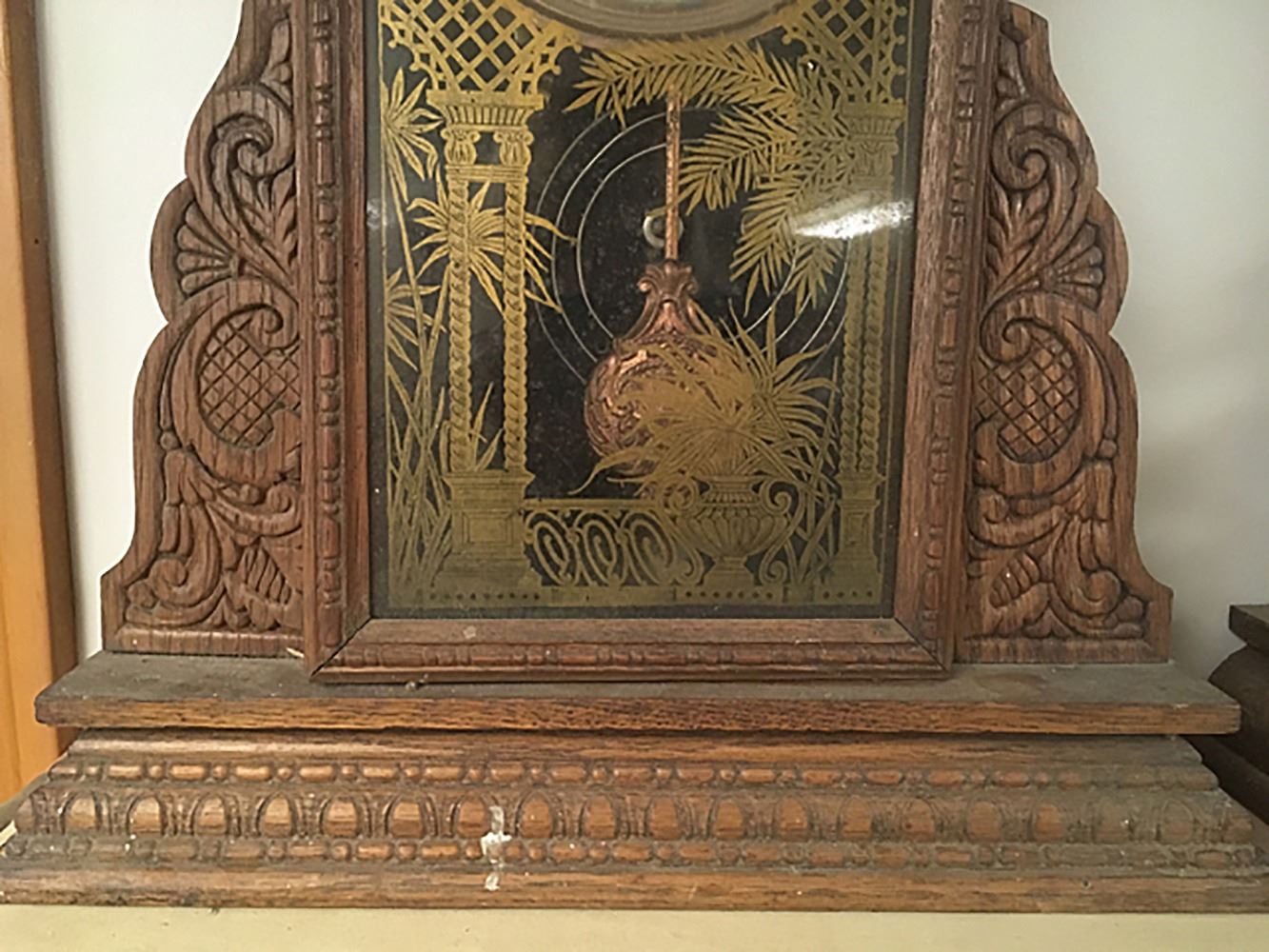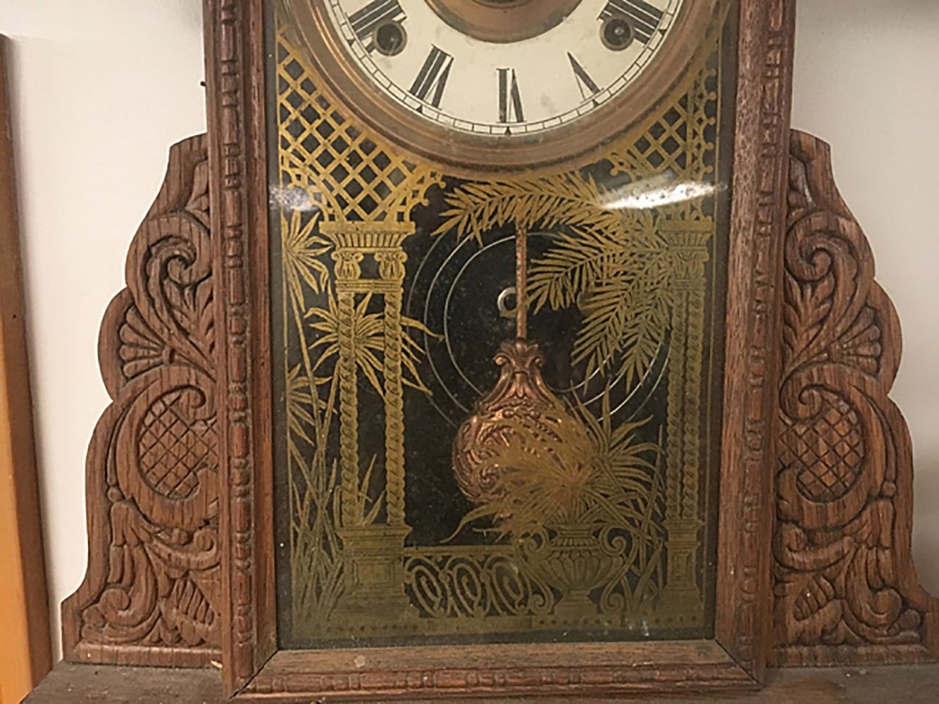 Gingerbread Shelf clock with alarm, beautiful splat, gold on glass with ferns and columns, pendulum.