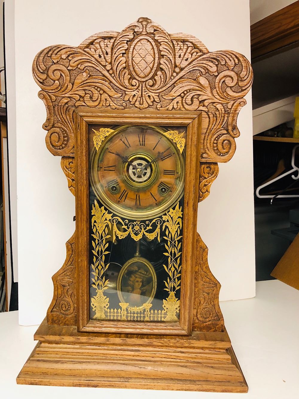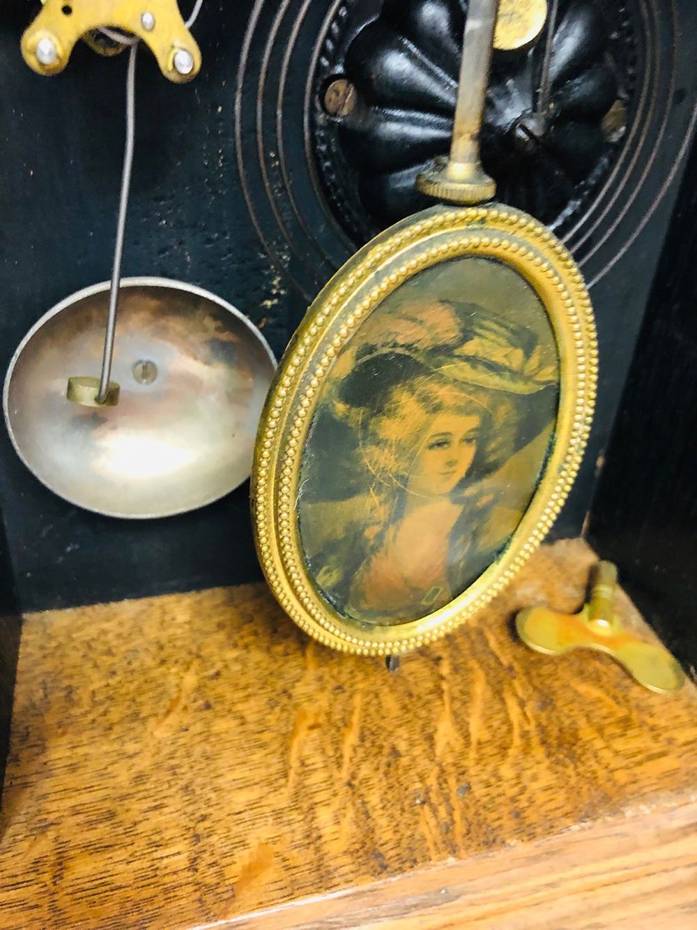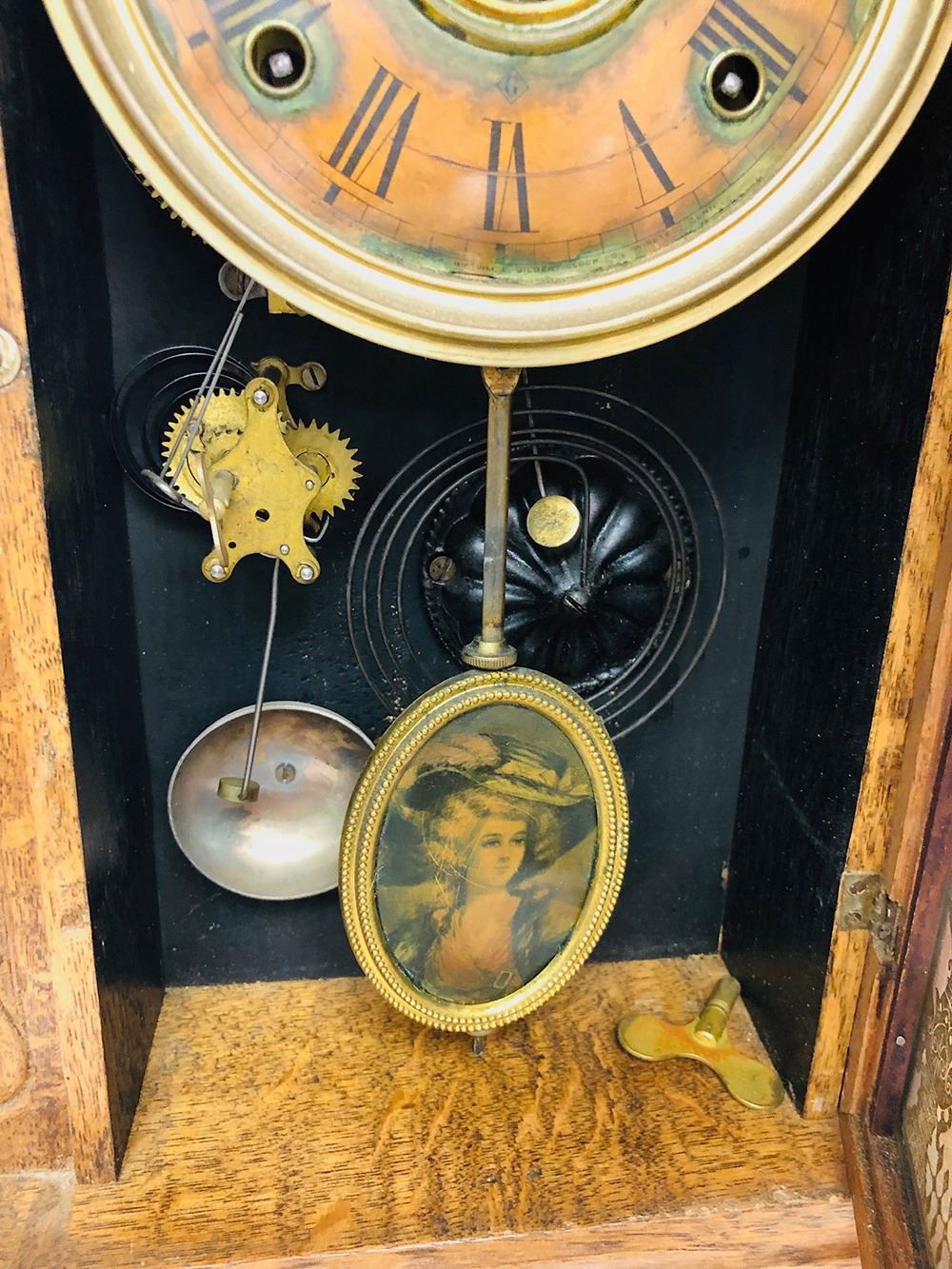 Gingerbread Shelf Clock with gold gilt on glass, Victorian lady on pendulum, key, and alarm.