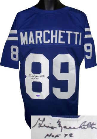 Gino Marchetti was selected to 11 Pro Bowls and was selected to the Pro Football Hall of Fame in 1972. Gino Marchetti has hand signed this Baltimore Colts Blue Prostyle TB Jersey with HOF 72 inscription. Certificate of Authenticity from Athlon Sports.
