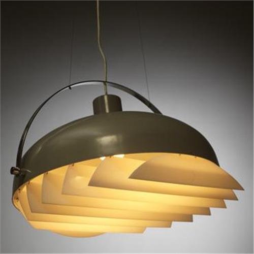 Gino Sarfatti<BR>ceiling lamp<BR>Arteluce<BR>Italy, c. 140<BR>chrome-plated brass, enameled aluminum, acrylic<BR>16 dia x 39 h inches<BR>This unique counterbalance lamp was never put into production. Signed with decal manufacturer's label to interior shade: [Arteluce].<BR>Literature: <BR><i>Undicesima Triennale: Milan 1957</i>, Pica, pg. XXXVI<BR>Exhibited: <BR>11th Triennale, Milan, 1957<BR><BR>Condition of the item is not included in this description. Condition reports are available from Wright upon request. Wright strongly recommends that you review a condition report for each item on which you plan to bid.