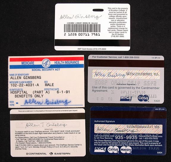 Ginsberg, Allen (1926-1997) American poet and a leading figure of the Beat Generation. His books include Howl (1956) and Kaddish)1961. A unique collection of five items: three credit cards, Social Society card and Brooklyn College Faculty card belonging, each belonging to Ginsburg and each signed "Allen Ginsburg." Offered at auction for the first time.