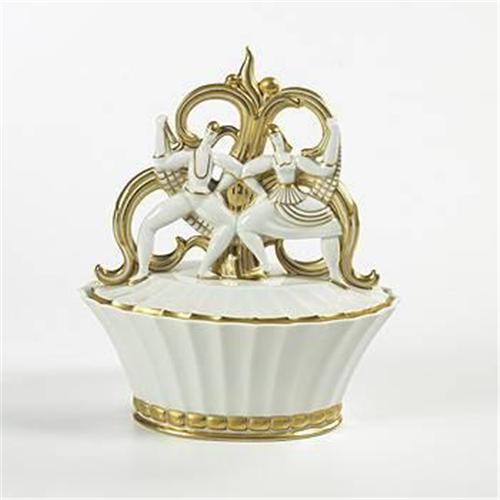 Gio Ponti<BR>Balletto lidded vase<BR>Richard Ginori<BR>Italy, 1925<BR>glazed porcelain<BR>9"w x 6"d x 10.75"h<BR>Stamped marks to underside: [Richard Ginori 27 = 6 Omaggio Agli Snob 1925 Made in Italy Richard Ginori Pittoria di Doccia 1925 Gio Ponti].<BR>Literature: Gio Ponti L'Arte Si Innamora Dell'Industria, La Pietra, pg. 26<BR>Provenance: Barry Friedman, New York<BR>Private collection<BR><BR>