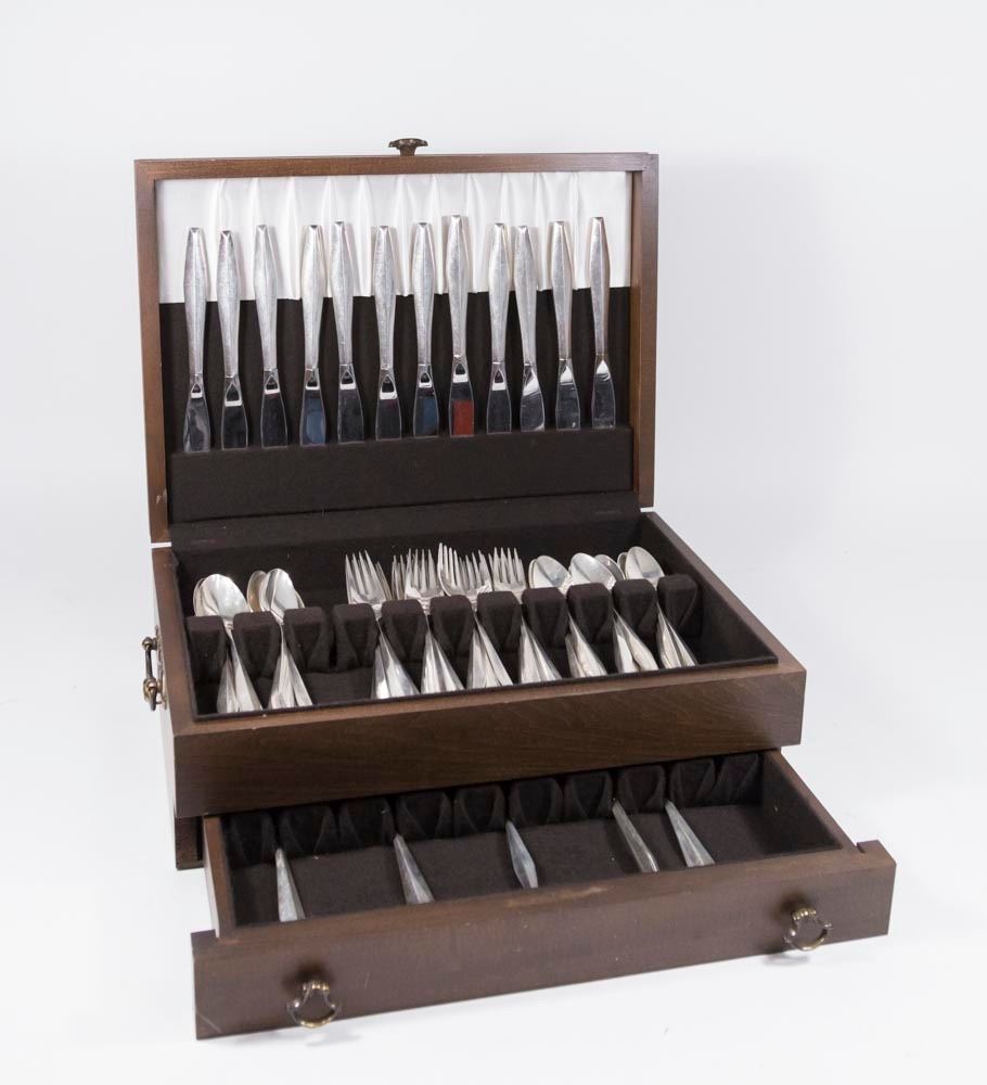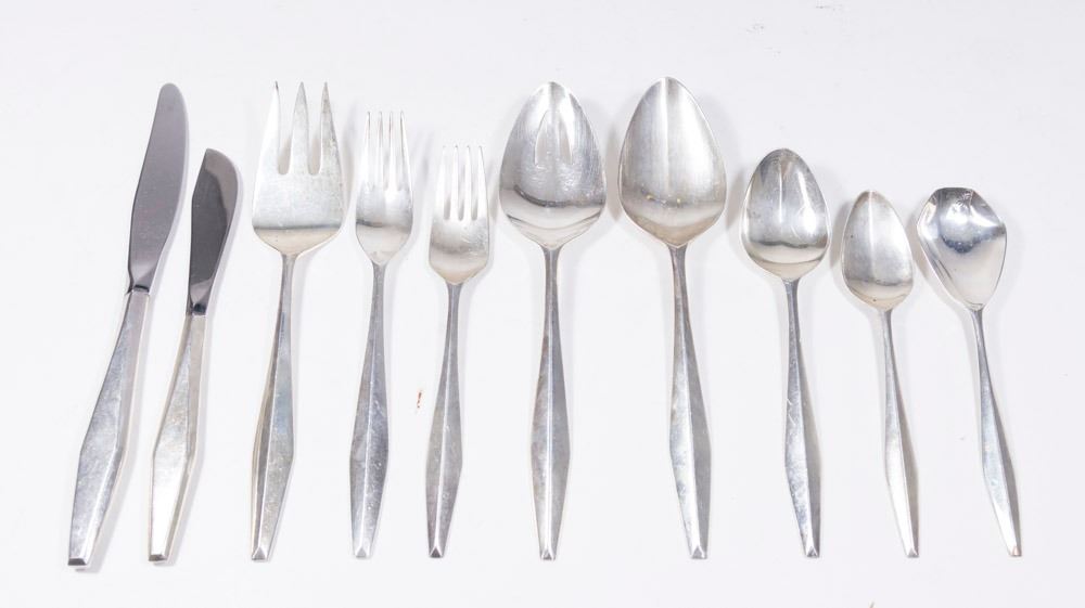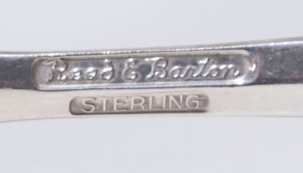 By Reed & Barton. Consisting of 12 tablespoons, 12 knives, 12 dessert forks, 18 teaspoons, 12 dinner forks, and 5 serving pieces. Total weight approx. 93 ozt plus knives.