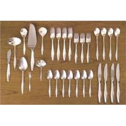Gio Ponti Diamond sterling silver flatware, by Reed & Barton, 1958, 30 pieces of solid sterling, impressed marks, the set consists of master butter, large ladle, sugar spoon, serving spoon, cake server, pickle fork, small ladle, bon-bon server, four dinner forks, three salad forks, four iced tea spoons, seven spoons and four dinner knives, excellent condition
