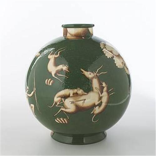 Gio Ponti Il Transporto e L'Uccisione del Diano vessel Richard Ginori Italy, 1928 glazed majolica 12 dia x 12.5 h inches This form is from the Game Hunting series that, along with the Classical Conversation and My Women series from the same time, displays Ponti's mastery of form and Italian decoration. Stamped manufacturer's marks to bottom. Literature: Gio Ponti: Le Maioliche, Manna, ppg. 148-149
