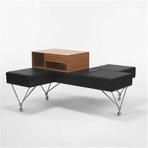 Gio Ponti Triposto bench Tecno Italy, 1967/1991 leather, chrome-plated steel, cherry 48 w x 48 d x 25.5 h inches Produced in a limited edition by Tecno, this bench features a small cabinet with drawers. Signed with applied metal label to side with impressed manufacturer's logo: [Colleczione ABV Gio Ponti 1967/1991]. Literature: Gio Ponti: Interni, Ogetti, Disegni, Falconi, ppg. 202-203 Gio Ponti - The Complete Works 1923-1978, Ponti, pg. 229