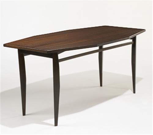 This dining set was custom made by Cassina for a private residence in Florence one year after the introduction of the Superleggera chair in 1957. The table top approximates the footprint of the Pirelli tower in Milan while the legs echo the angularity of the Superleggera frame. The set represents a rare embodiment of the weightless aesthetic first developed by Ponti with his legendary Superleggera chair. Sold with certificate from the Gio Ponti Archives.