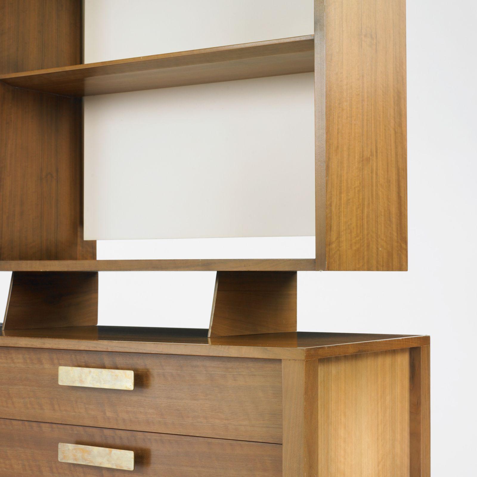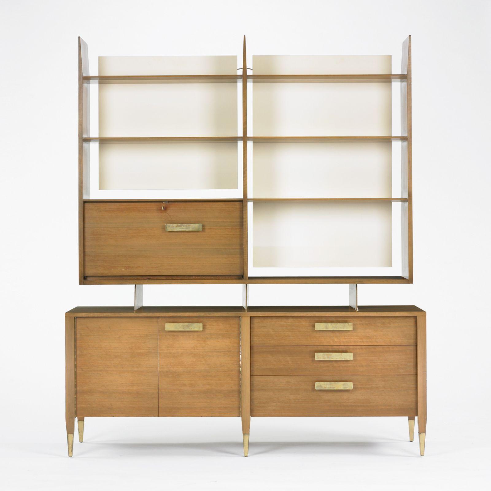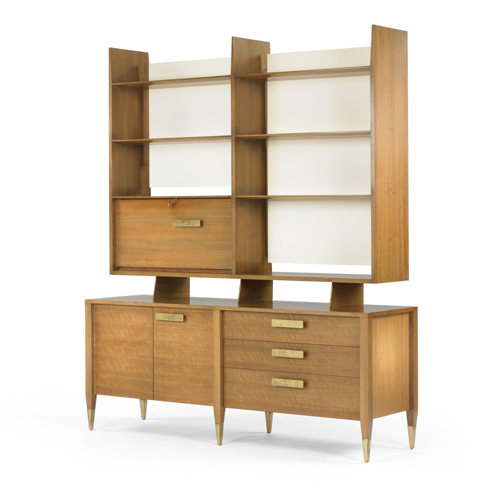 Sold with original invoice from Singer & Sons. Cabinet features three drawers, backlit shelving, two doors and one drop-down door concealing storage. Signed with decal manufacturer's label to drawer: [M. Singer & Sons New York Chicago].