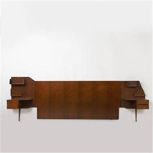 Gio Ponti headboard, model #2180 Singer & Sons Italy/USA, c. 1950 walnut, brass 132.5 w x 16 d x 37.5 h inches Signed with manufacturer's label to drawer.
