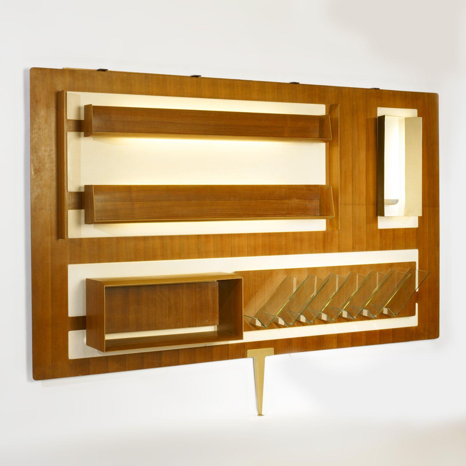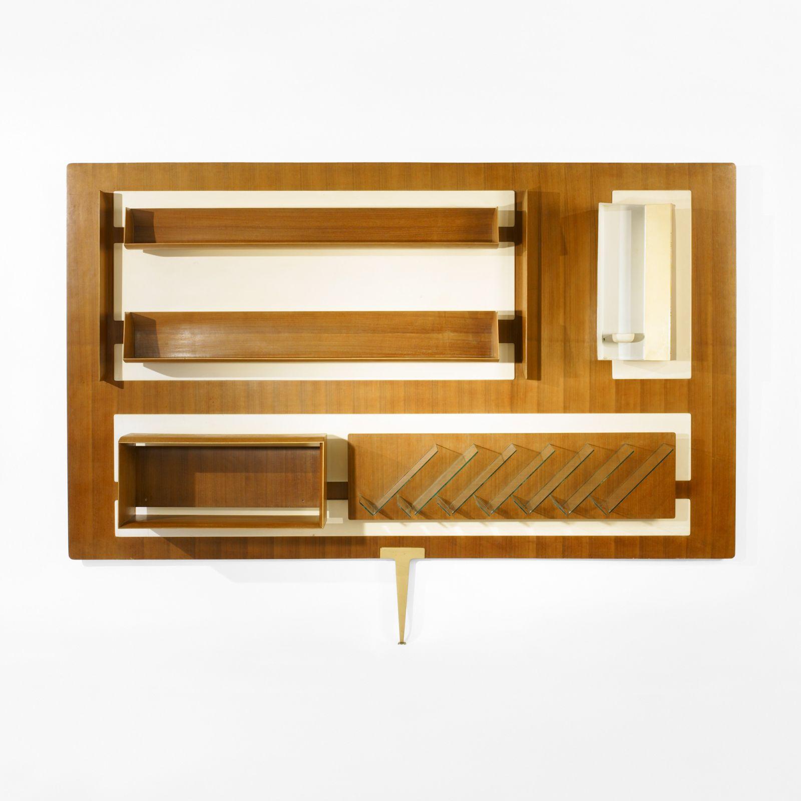 walnut, lacquered wood, brass, enameled brass, tempered glass