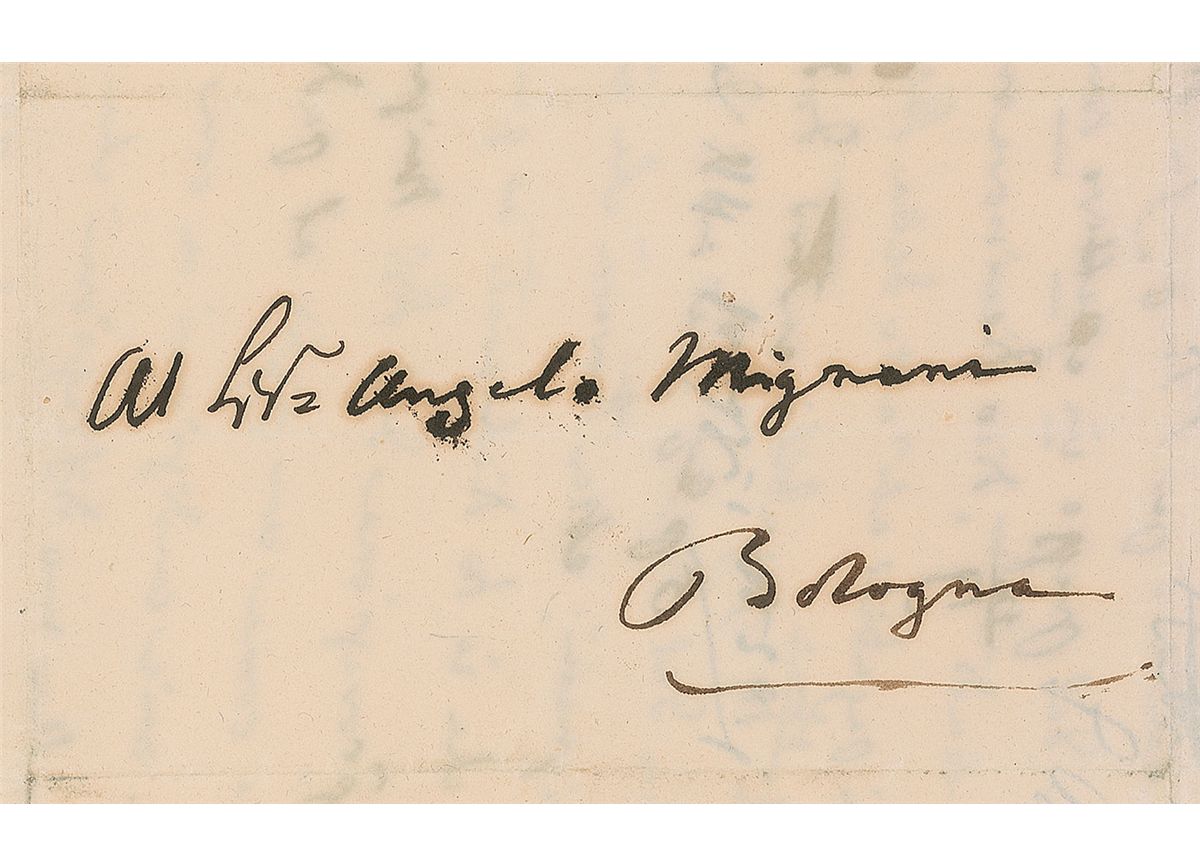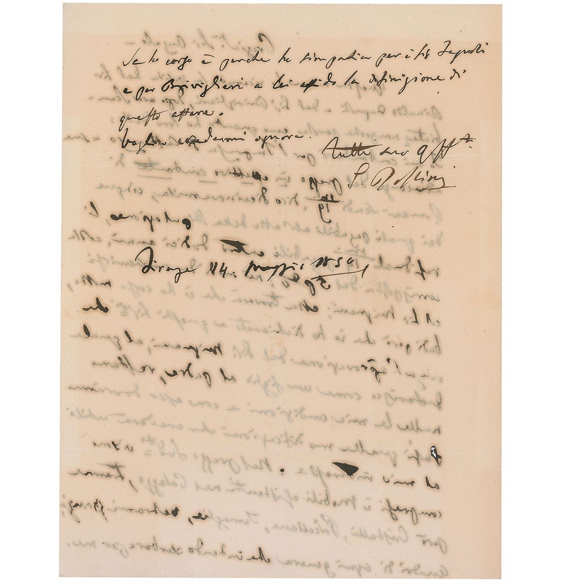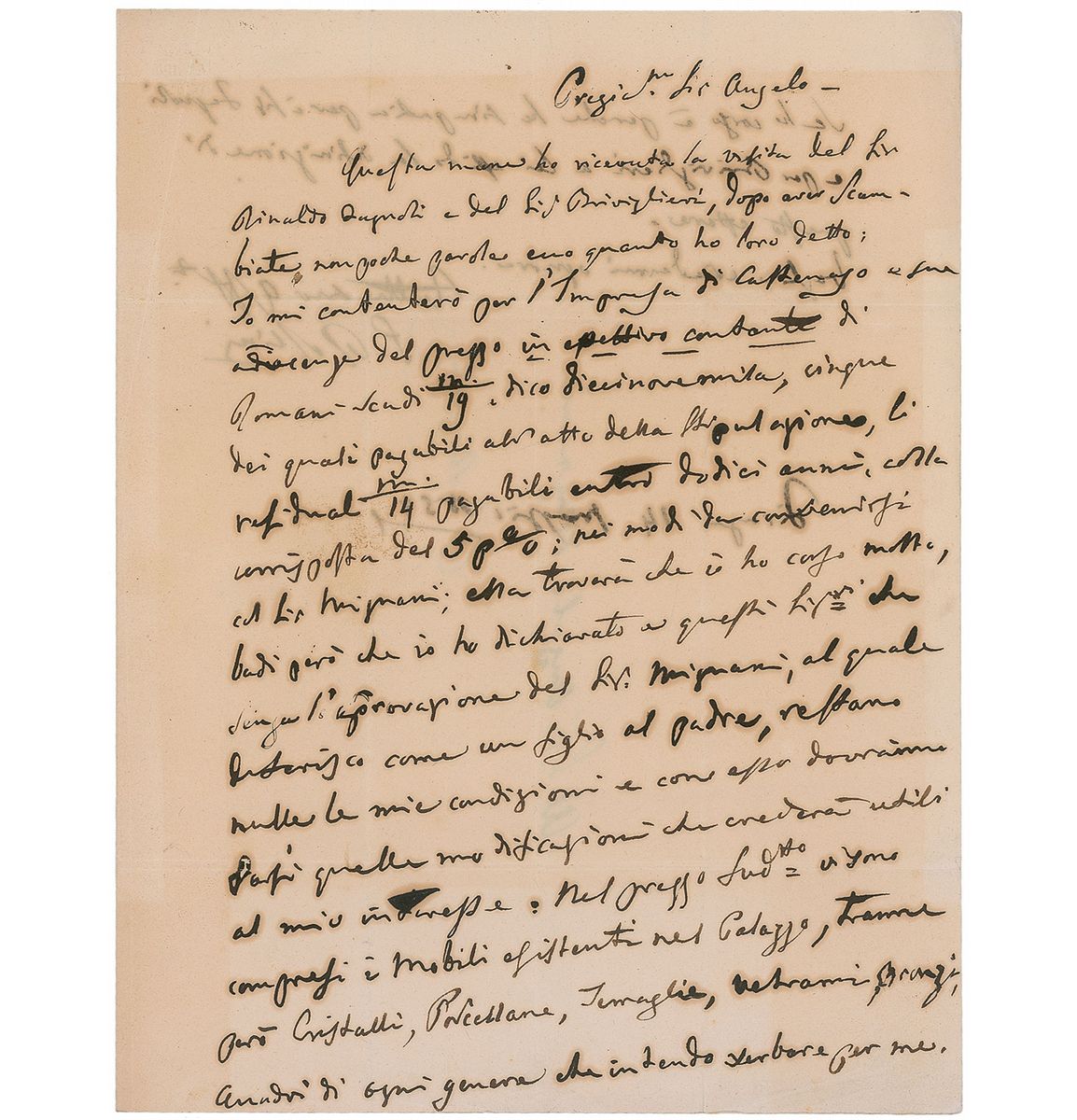 Important Italian composer (1792–1868) who became one of the seminal figures in the history of opera with such repertoire staples as The Barber of Seville and William Tell. ALS in Italian, signed “G. Rossini,” one page both sides, 8 x 10.5, May 14, 1850. Untranslated letter to “Angelo” concerning the sale of a residence for 19,000 scudi without the rented furniture, the glass, china, pottery, or antique busts. In very good condition, with intersecting folds, light toning, some haloing to ink, and moderate to heavy show-through from writing to opposing sides.