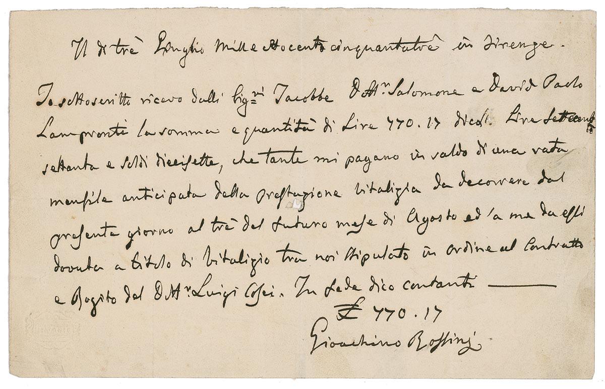 Important Italian composer (1792–1868) who became one of the seminal figures in the history of opera with such repertoire staples as the Barber of Seville and William Tell. ALS in Italian, one page, 8.5 x 5.5, no date. Letter to an unidentified recipient regarding a pending financial matter. In fine condition, with several vertical folds, one through a single letter of signature, light wrinkling and creasing, and a small hole to center of page. Pre-certified PSA/DNA and RRAuction COA.