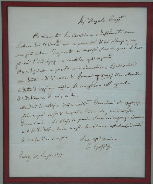 Fine Handwritten letter in italian letter written and signed in hand by Rossini, to his attorney appointed for his affairs and business transactions. Beautifully framed with engraving in fine condition. the letter in full reads: " To: Sig.n Angelo Mignani,Papal State Bologna Dear I received the very dear and much awaited letter you wrote me on the 17th of this month. I was very much concerned over your silence: now I am much relieved. As for the M______?) go right ahead and be harsh, for it is useless to be indulgent with the ungrateful. I made out to this banker of mine, Rothschild, a draft in your favor of 8000 (francs ?). Tell Momiler (?) that it is dated today and payable on sight. Please cash it and charge it to my account. I shall be awaiting the news of the sale of Doncredi (?) which, I suppose, will be useful to what 1s left of a magnificent patrimony. Give my best regards to Donna Maria. Please give my regards also to Mr. & Mrs. Bonora and to Sr. Landolfi. My wife returns your kind greetings. I remain, as always, your affectionate friend, G. Rossini Passy, July 24, 1858" Gioachino Antonio Rossini (29 February 1792 – 13 November 1868) was an Italian composer who wrote 39 operas as well as sacred music, chamber music, songs, and some instrumental and piano pieces.His best-known operas include the Italian comedies Il barbiere di Siviglia (The Barber of Seville) and La Cenerentola and the French-language epics Moïse et Pharaon and Guillaume Tell, led to his nickname "The Italian Mozart".Until his retirement in 1829, Rossini had been the most popular opera composer in history