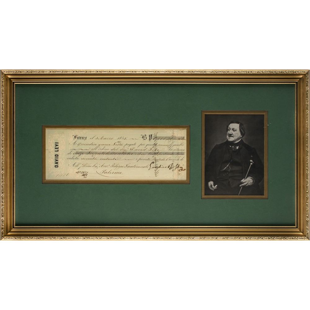 Partly-printed DS in Italian, one page, 9.5 x 3.5, March 5, 1855. Untranslated pay order issued to Filippe Santocanale and directing him to pay a sum "to the order of David Levi." Signed boldly at the conclusion by Gioachino Rossini. Double-matted and framed with a portrait to an overall size of 20.75 x 11.75. In fine condition.