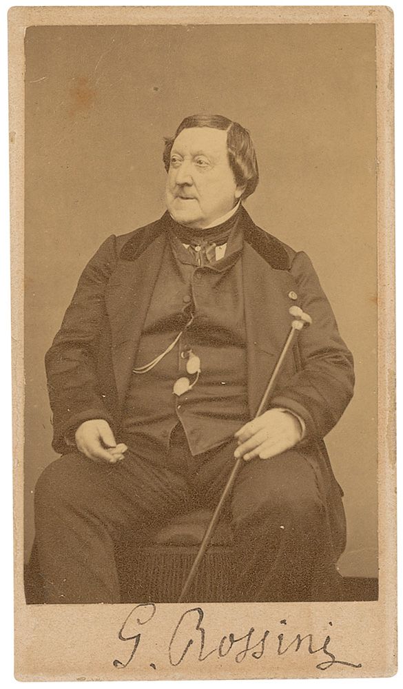Important Italian composer (1792–1868) who became one of the seminal figures in the history of opera with such repertoire staples as The Barber of Seville and William Tell. Original 2.25 x 4.25 carte-de-visite portrait of Rossini, by an anonymous studio, signed in the lower border in black ink, “G. Rossini.” Reverse also signed and inscribed in black ink, “Souvenir de Sympathie e de Reconnaissance offert a Mr. G. Brandus, G. Rossini, Paris, 16 Jan. 1867.” In fine condition, with some light scattered toning and soiling. Brandus was one of the most important music publishers in Paris and published Rossini’s Petite Messe in 1869, shortly after the composer’s death.