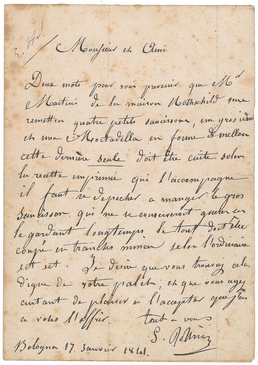 LS signed “G. Rossini,” one page, 5.75 x 8.25, January 17, 1841. Letter to the Marquis of Lasmarismas, regarding gourmet food from the House of Rothschild. In very good to fine condition, with moderate overall foxing.