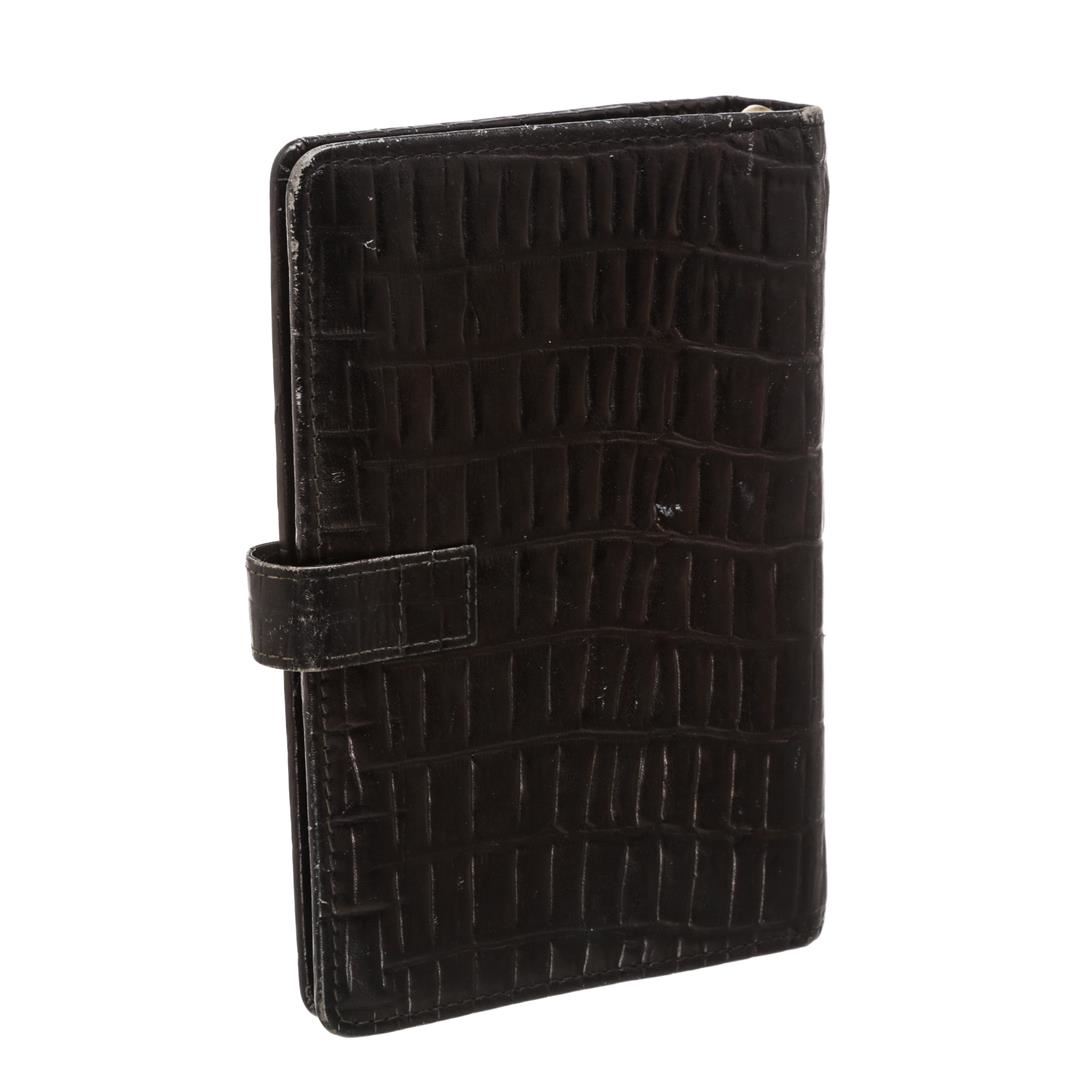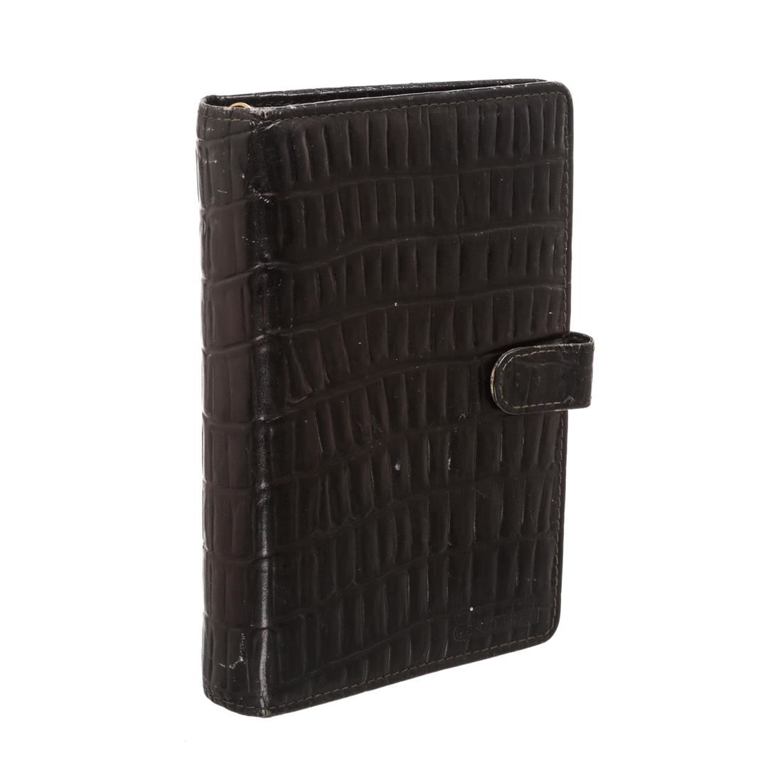 Brown leather Giorgio Armani leather embossed six ring agenda notebook with gold-tone hardware, tonal leather lining, three side slip pockets one business card slip pocket and button snap closure. Agenda paper no included.