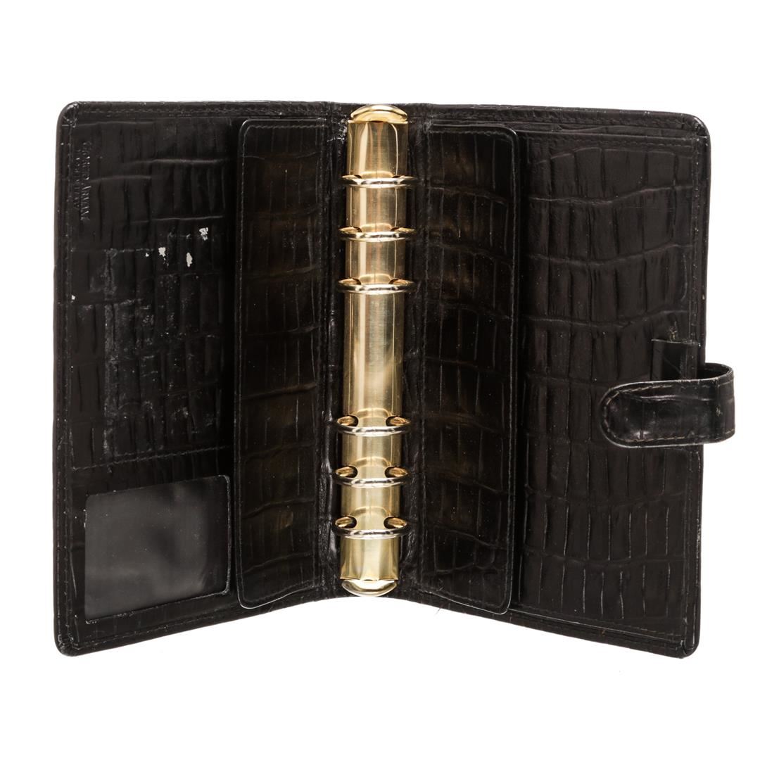 Brown leather Giorgio Armani leather embossed six ring agenda notebook with gold-tone hardware, tonal leather lining, three side slip pockets one business card slip pocket and button snap closure. Agenda paper no included.