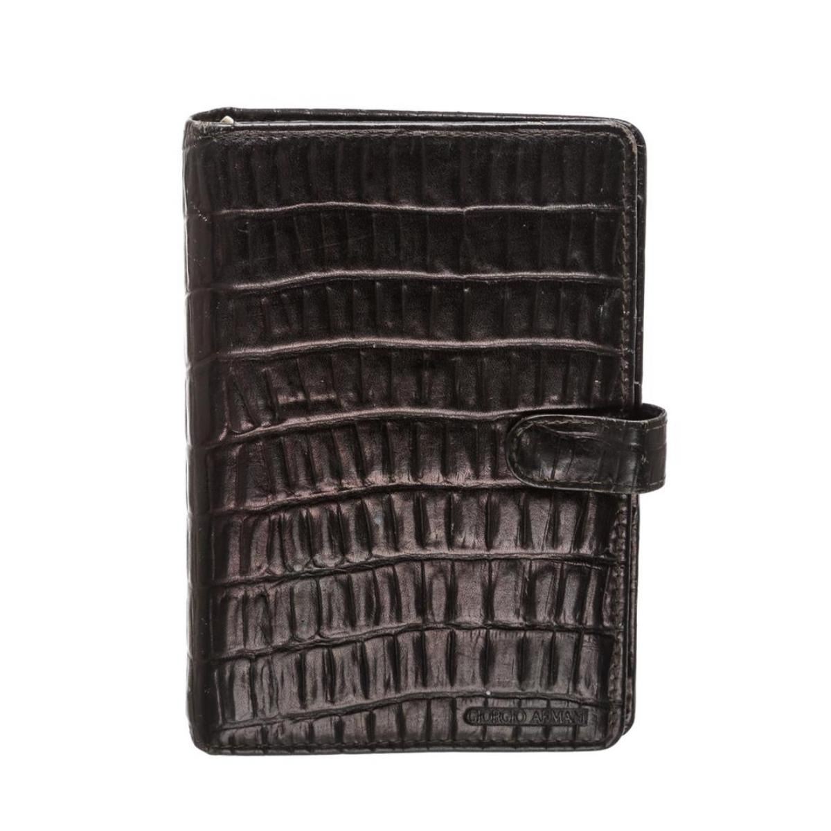 Brown leather Giorgio Armani leather embossed six ring agenda notebook with gold-tone hardware, tonal leather lining, three side slip pockets one business card slip pocket and button snap closure. Agenda paper no included.