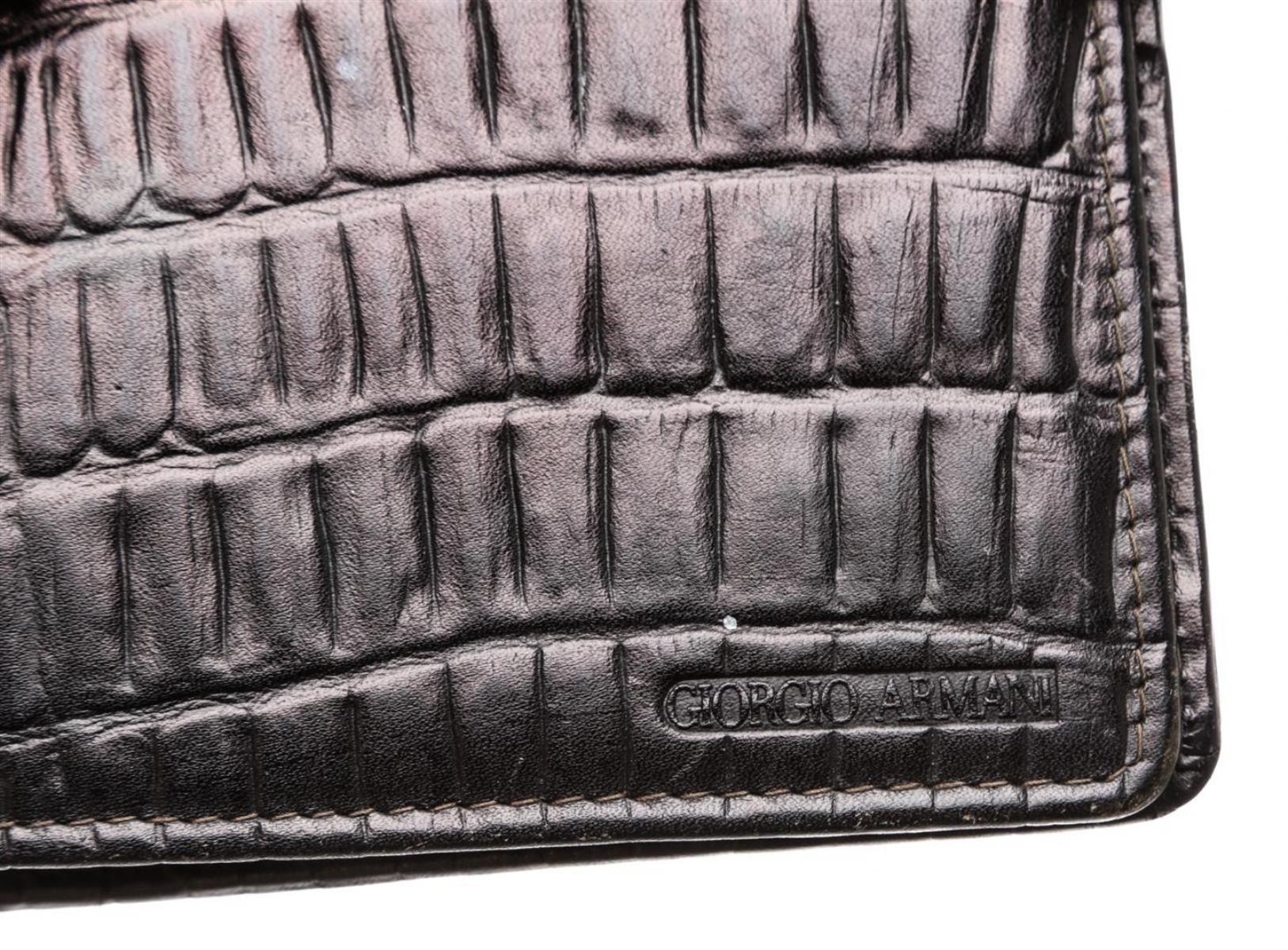 One Giorgio Armani Brown Leather Embossed Agenda Notebook. Brown leather Giorgio Armani leather embossed six ring agenda notebook with gold-tone hardware, tonal leather lining, three side slip pockets one business card slip pocket and button snap closure. Agenda paper not included.