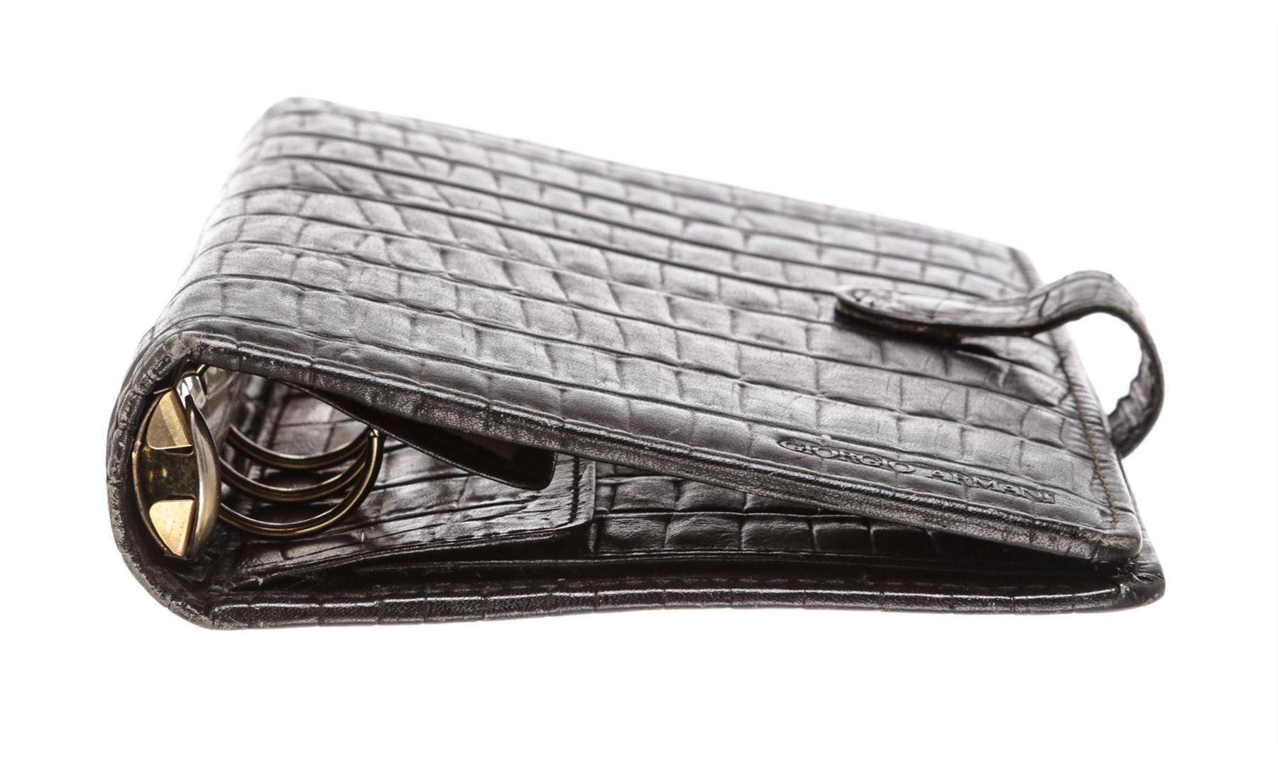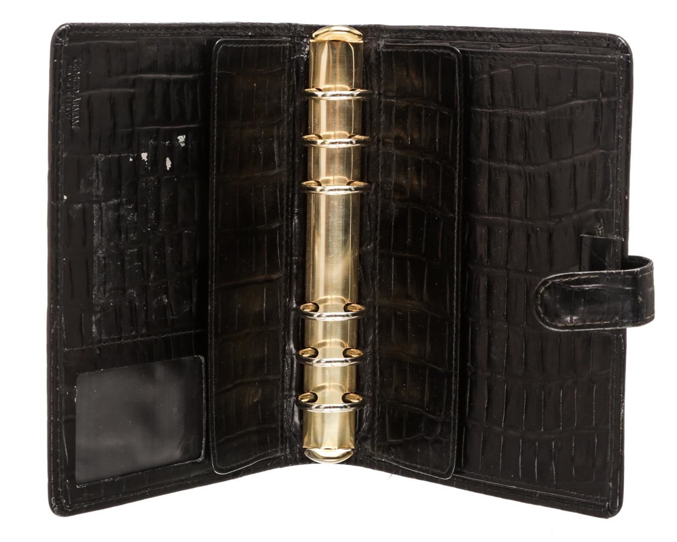 Brown leather Giorgio Armani leather embossed six ring agenda notebook with gold-tone hardware, tonal leather lining, three side slip pockets one business card slip pocket and button snap closure. Agenda paper not included.