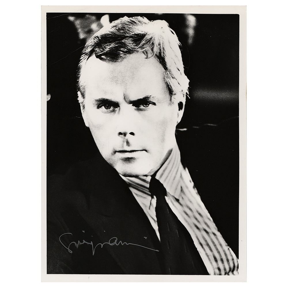 Glossy 7 x 9.25 portrait of fashion icon Giorgio Armani casting a penetrating gaze, signed in silver ink. In very good condition, with some scattered surface creases toward the top.