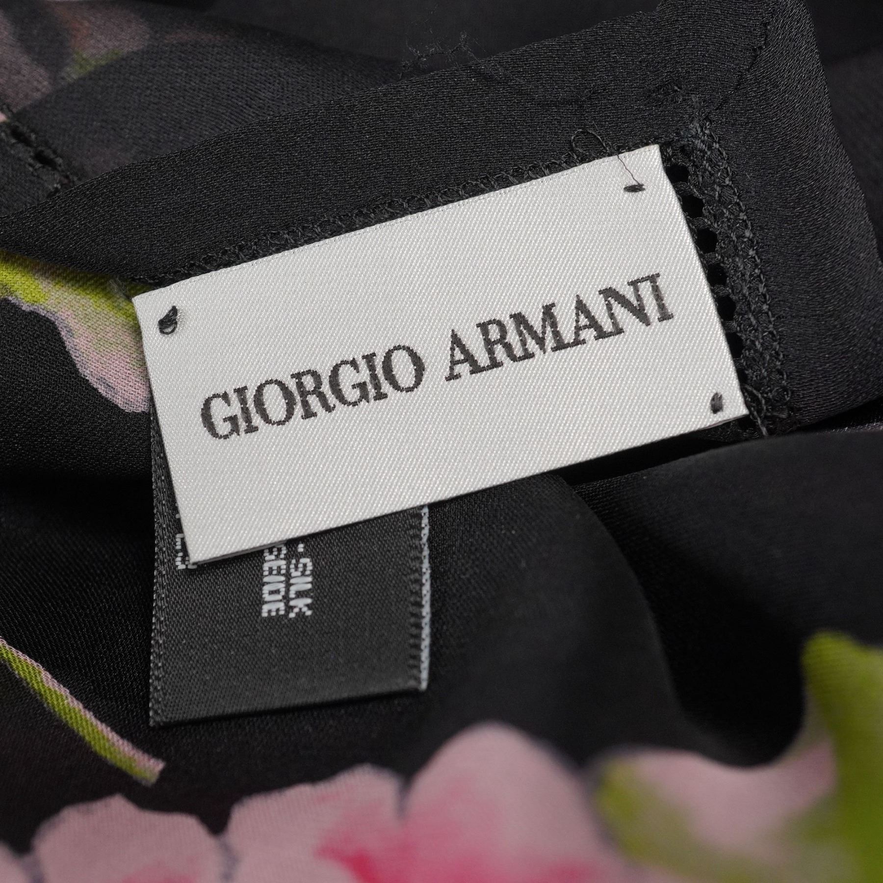 A superb Giorgio Armani pure silk scarf featuring a striking black ground adorned with large, painterly peony blossoms in soft shades of pink, rose, and white with accents of green foliage. The delicate balance of bold floral motifs against the dark background exemplifies Armani's mastery of understated elegance and romantic sophistication. The scarf is finely woven with a luxurious, fluid drape and finished edges showcasing meticulous Italian craftsmanship. Ideal as a statement accessory or a collector's textile piece.