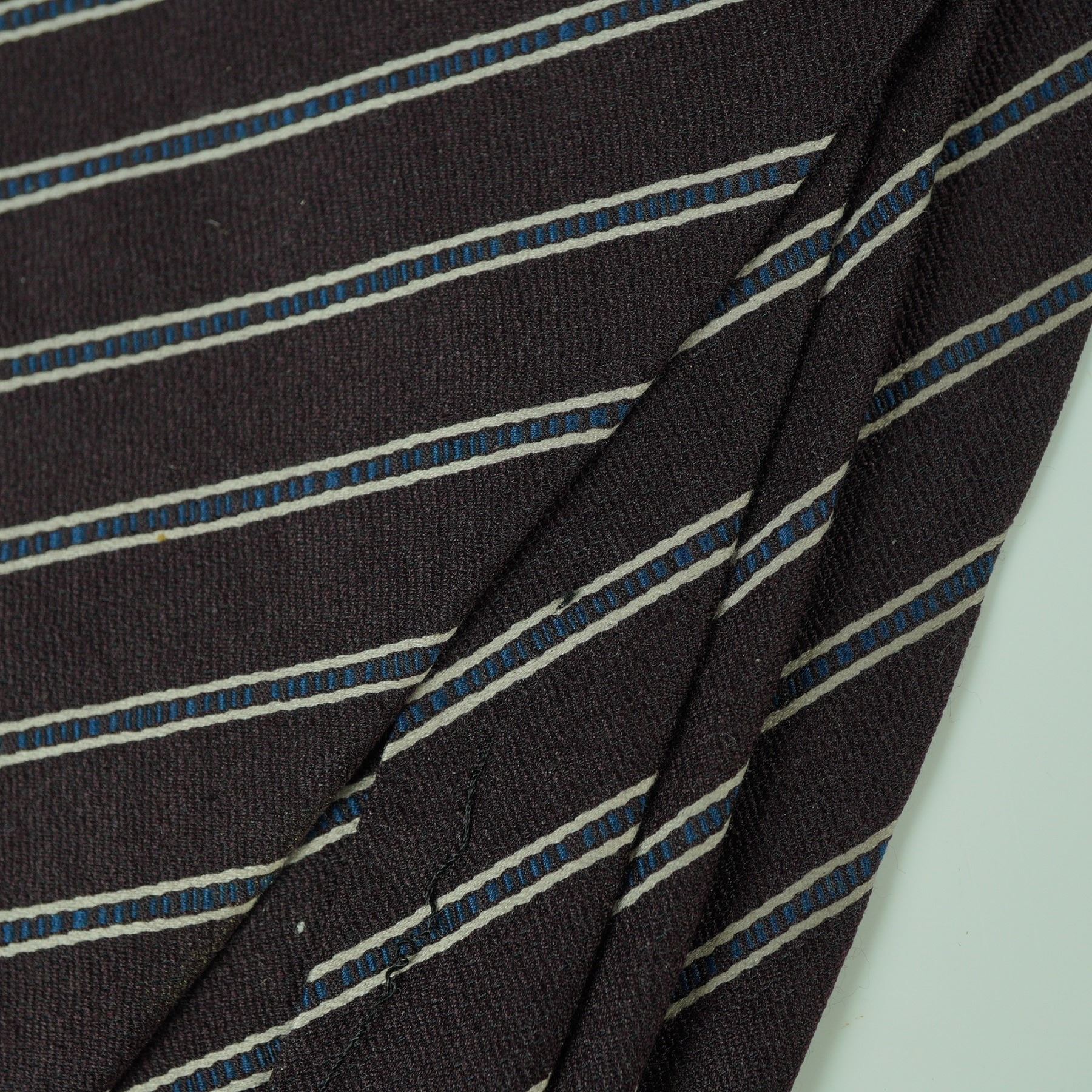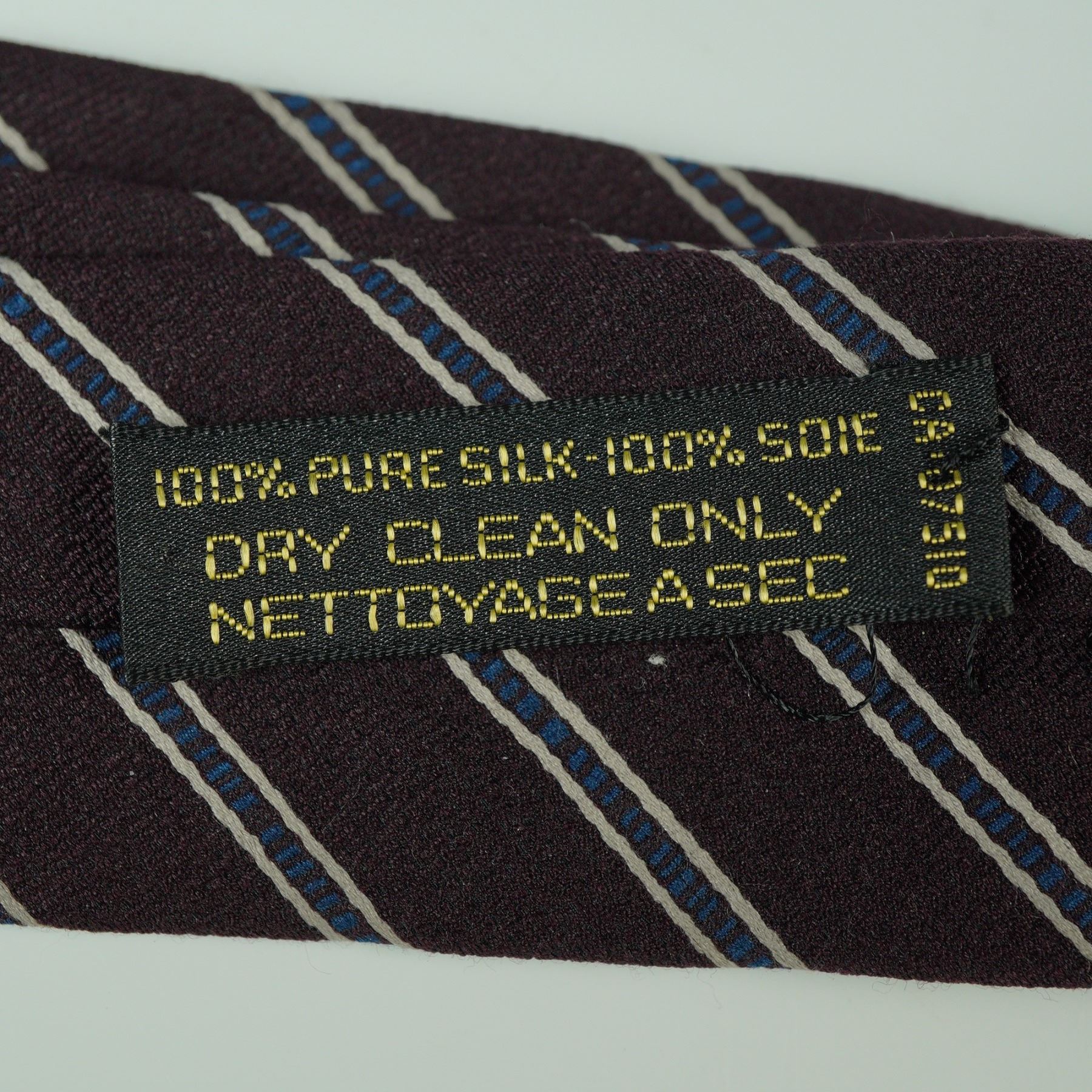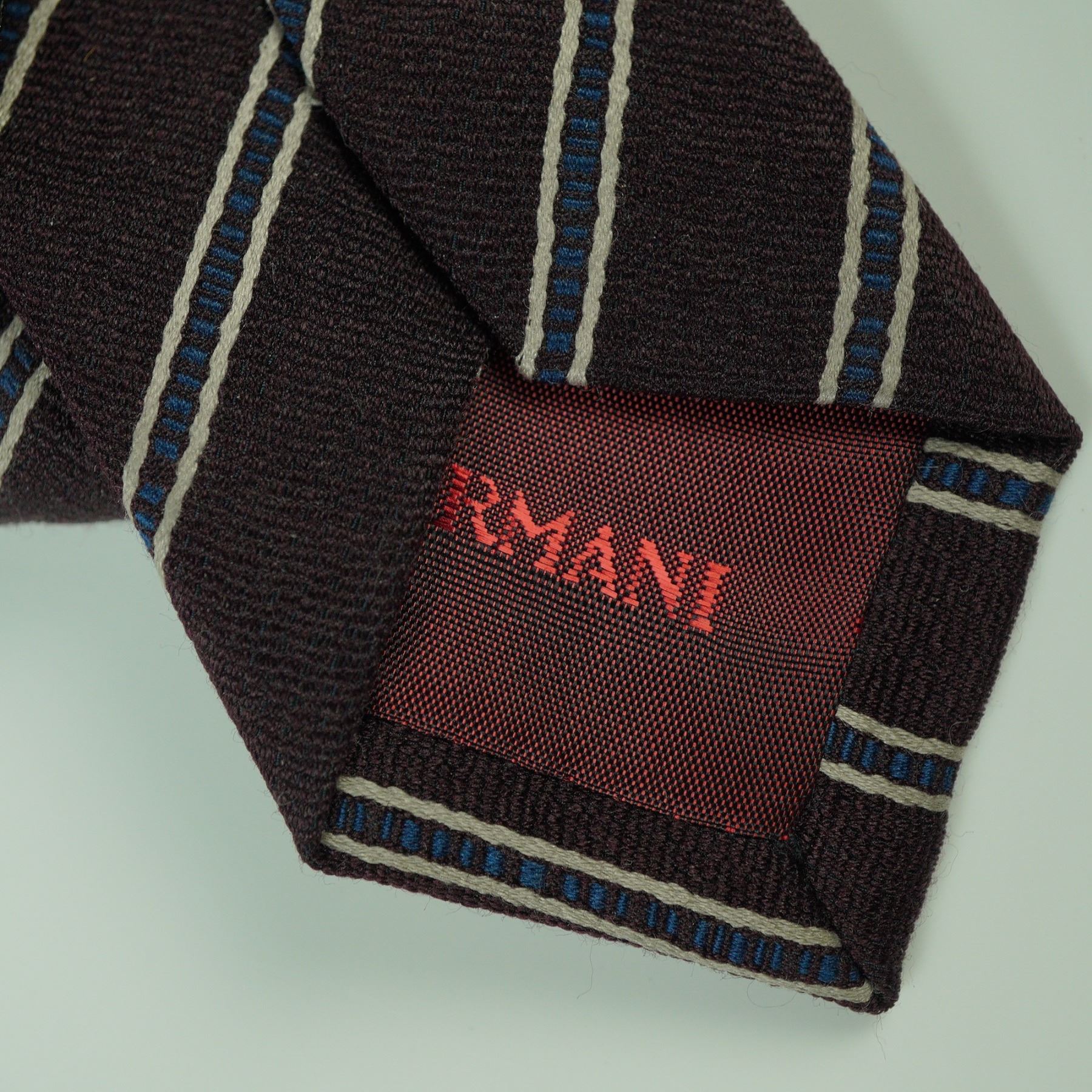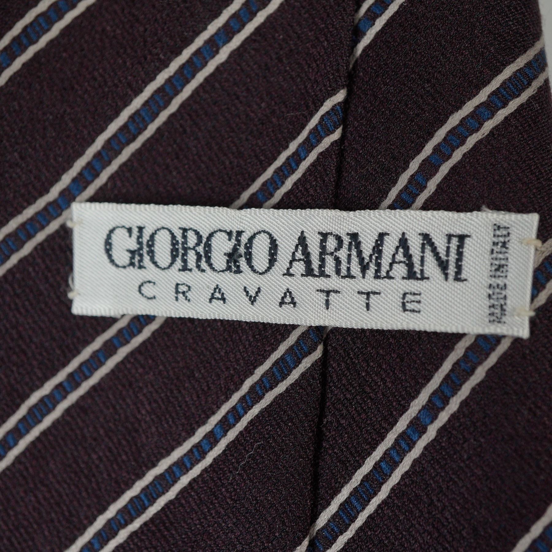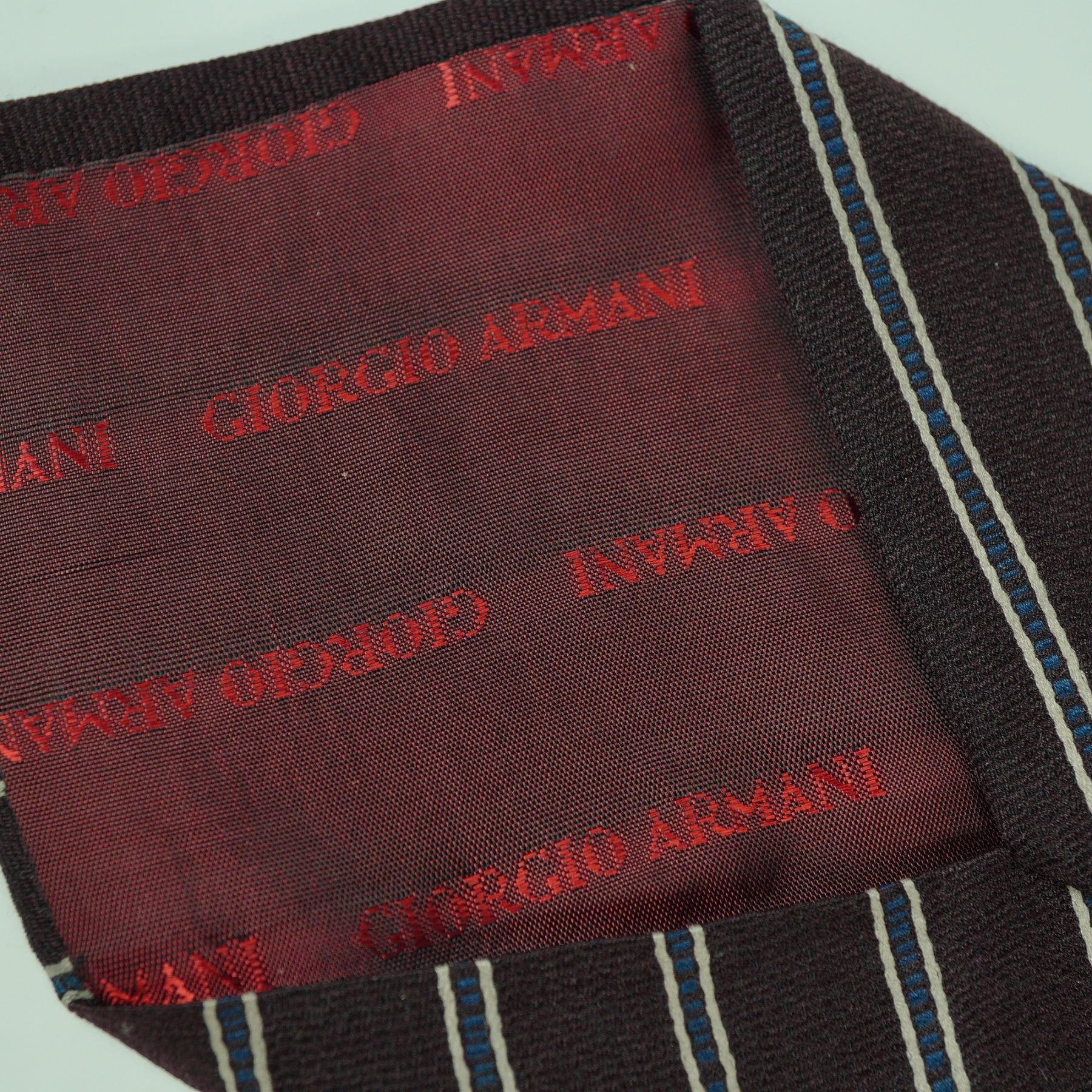 A refined silk necktie by Giorgio Armani, featuring a classic diagonal stripe design in brown with alternating white and blue detailing. The interior lining bears a repeating Armani logo in red for a discreet designer finish. A timeless and versatile piece suitable for both formal and professional ensembles.