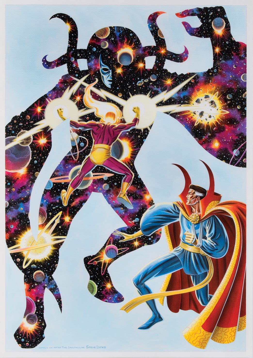 125. Giorgio Comolo original painting featuring "Dr. Strange" (after Steve Ditko). (ca. 2000s) Accomplished in ink and gouache on 16 x 23.5 in. textured art board. "Eternity", "Dormammu", and "Dr. Strange" are featured on the faithful and sublime recreation/homage to the great Steve Ditko. Very nicely and finely detailed and imaginative rendering made to frame and hang. Signed and dedicated by the artist, lower left. In very good condition. $500 - $700