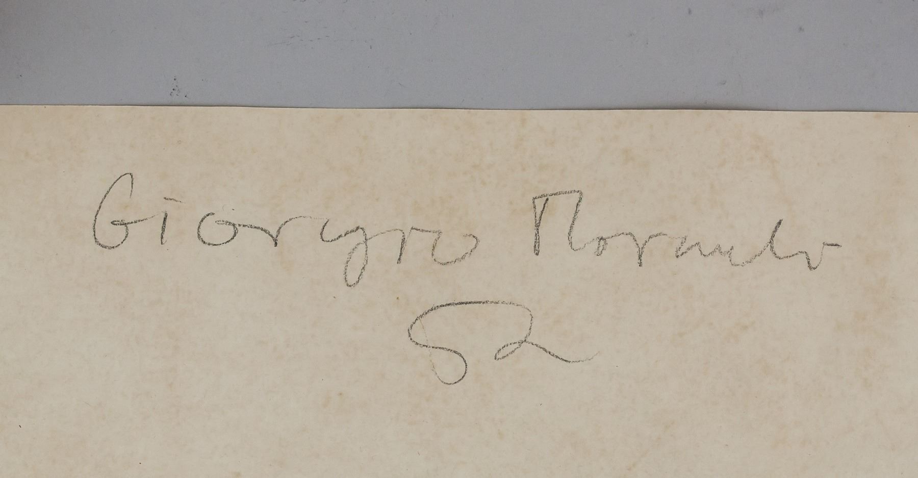 Gouache on paper. Featuring a modernist still of vases, candle holders and milk jugs with cups. Signed Morandi on the lower right corner. Inscribed Giorgio Morandi 52 in pencil and stamped Charles Egan NY, verso. Attributed to Giorgio Morandi (1890-1964, Italian). 19.5 x 28 cm (7.25 x 11 in). PROVENANCE: Southern Ontario estate